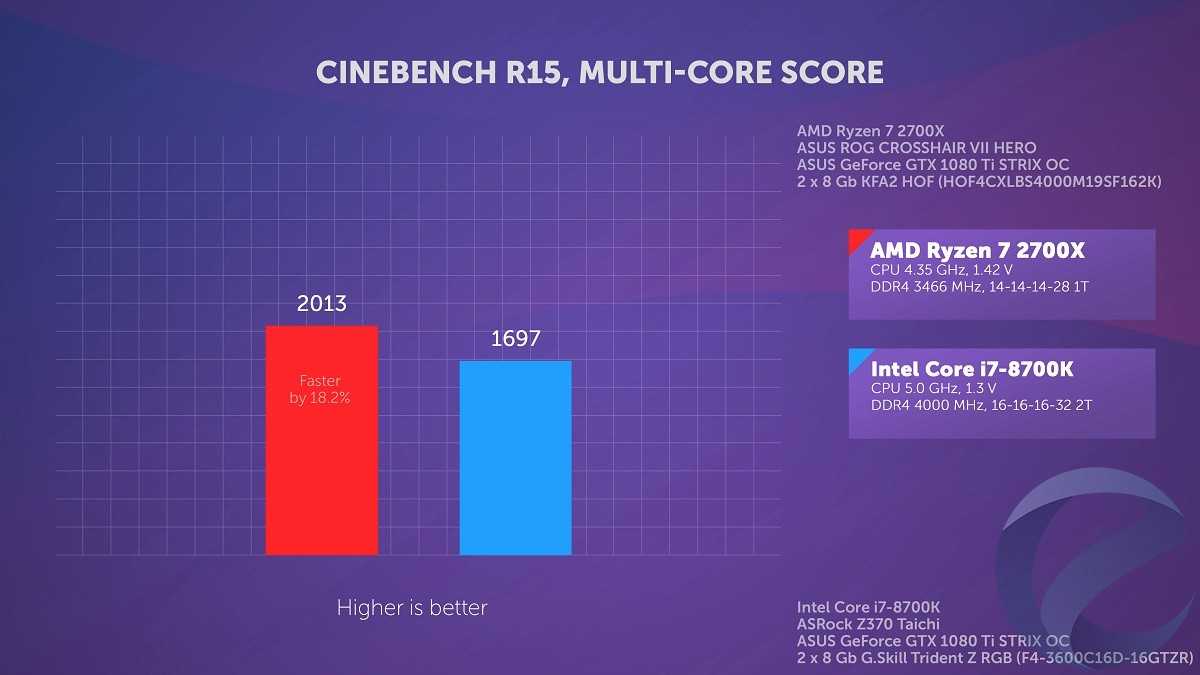 Логичное продолжение истории Blender находим в Cinebench R15. Воднопоточной производительности Intel Core i7-8700K оказывается вне конкуренции, но в многопоточной проигрывает на 18%.