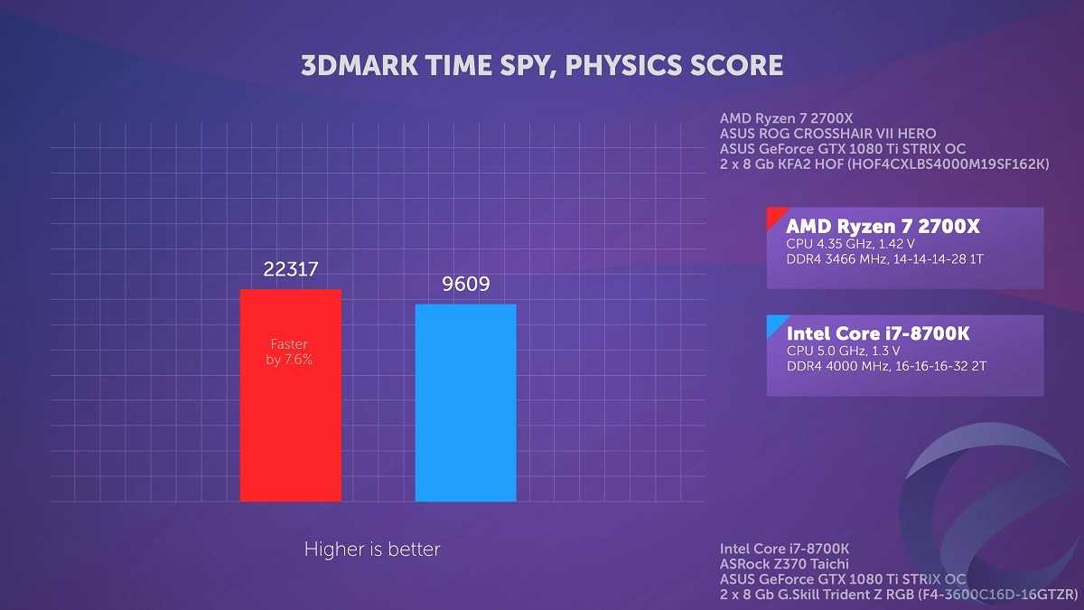 Физические тесты комплекса приложений 3DMark в одном случае уравнивают процессоры, во втором — дают небольшое преимущество восьмиядерному Ryzen 7.