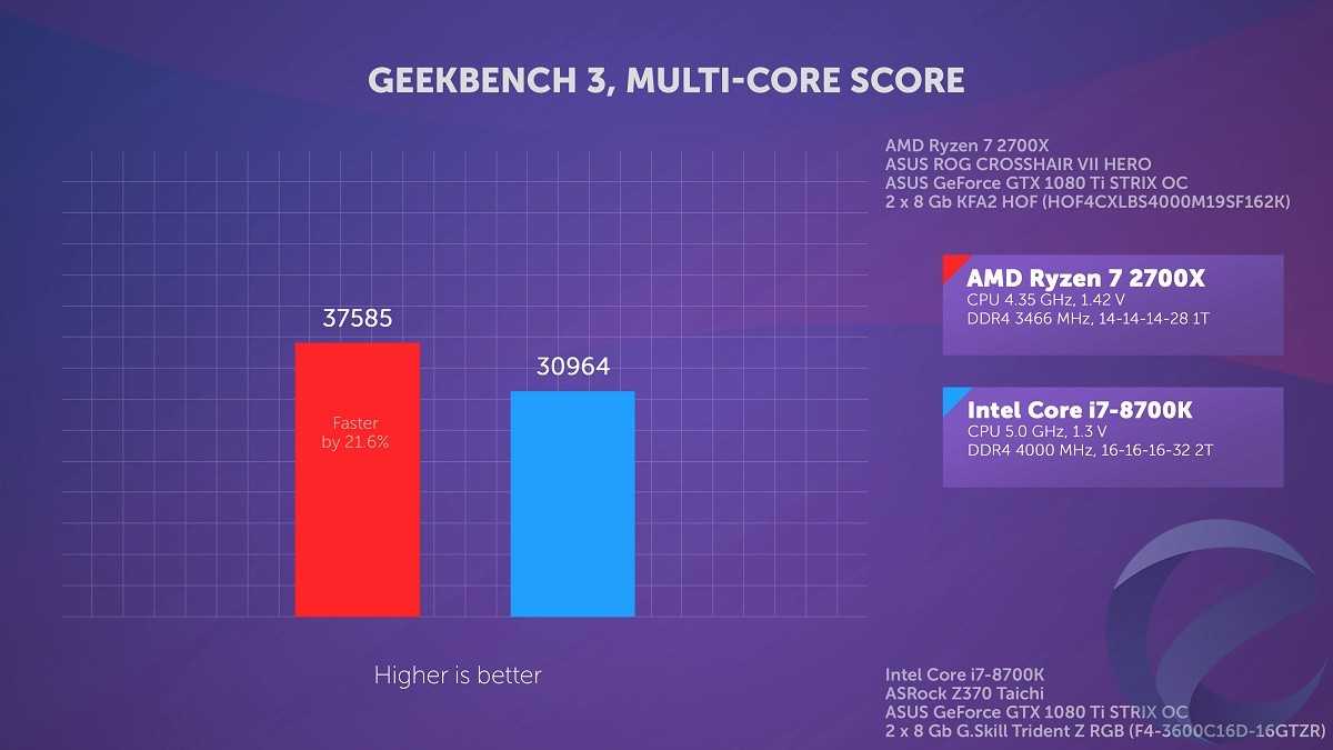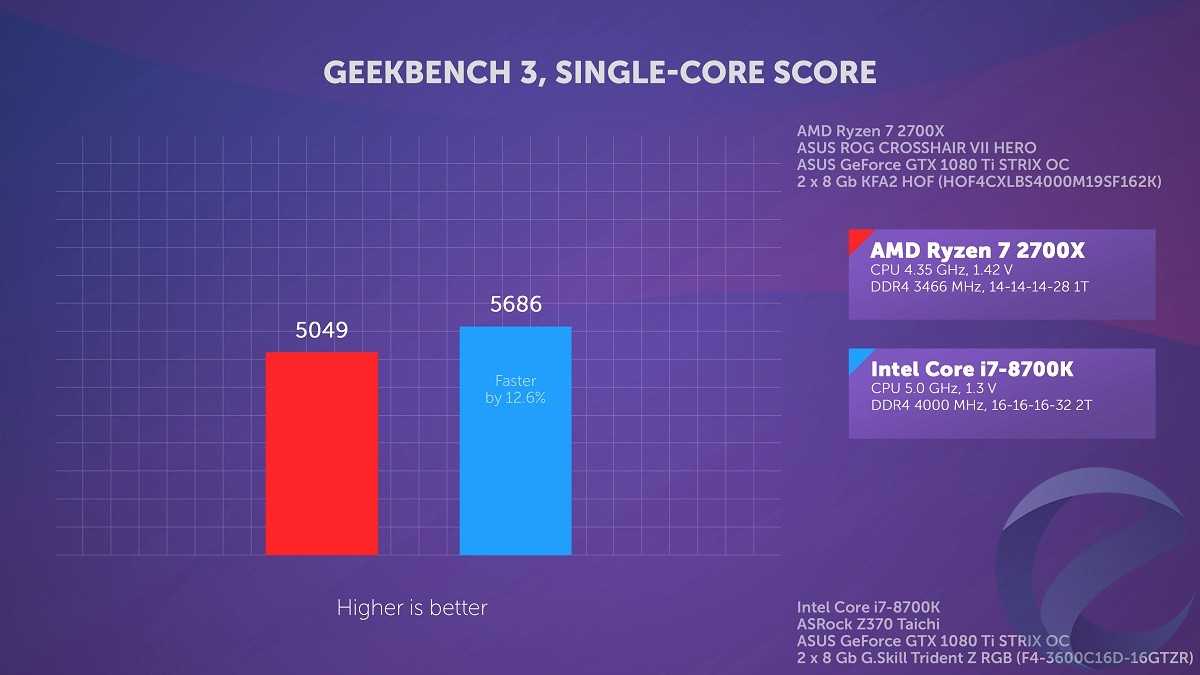Контроллер памяти Coffee Lake оптимизирован для работы с высокочастотной памятью, однако на AMD результаты более приближены к теоретическому максимуму DDR4. В таких условиях преобладание Intel Core i7-8700K варьируется от 11 до 21%.