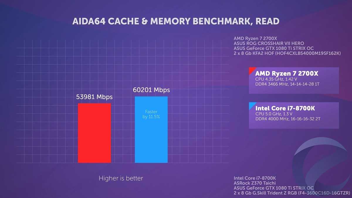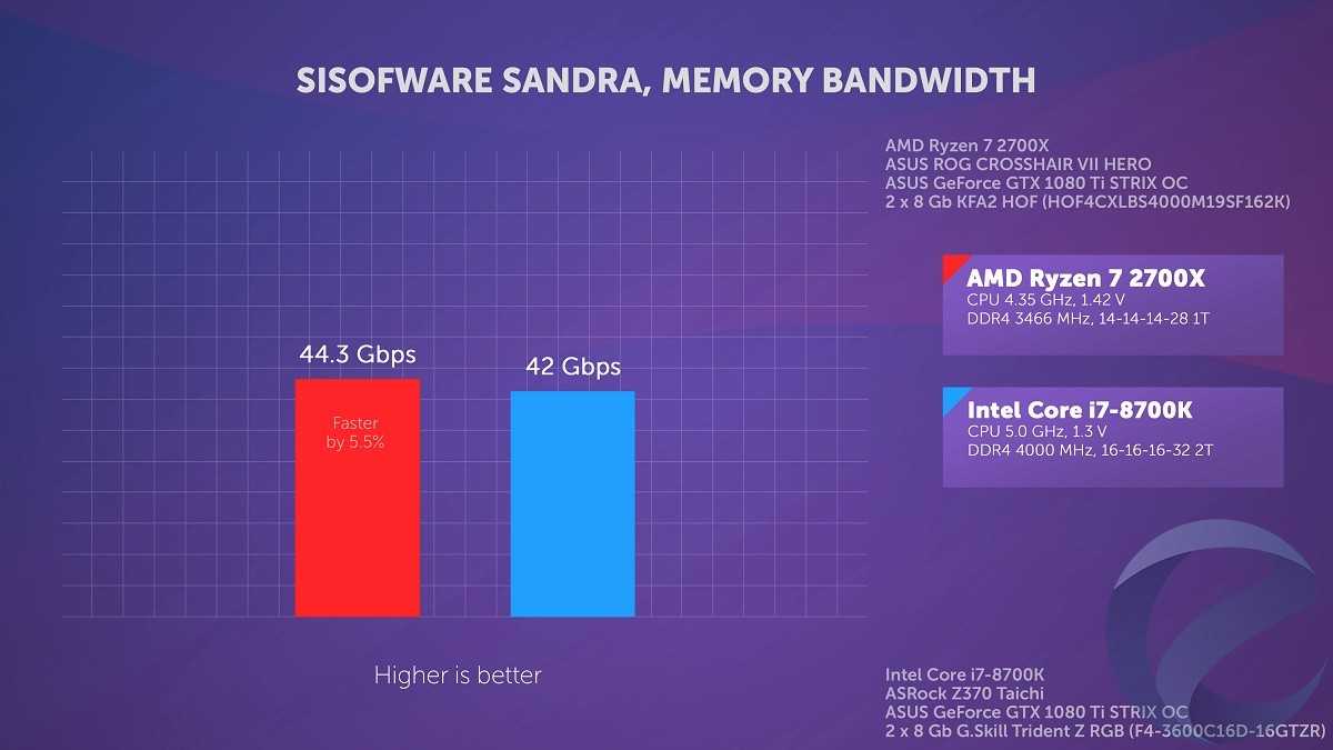 Несмотря на более высокую частоту памяти у Intel Core i7-8700K, лучшая утилизация ресурсов играет на руку AMD. Пропускная способность памяти оказывается на 5.5% выше, а вот кольцевая шина делает своё дело, продвигая i7-8700K в лидеры на 5%.