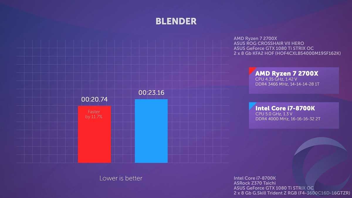 Во время рендеринга в Blender процессоры Core i7-8700K и Ryzen 7 1700X идут буквально ноздря в ноздрю.