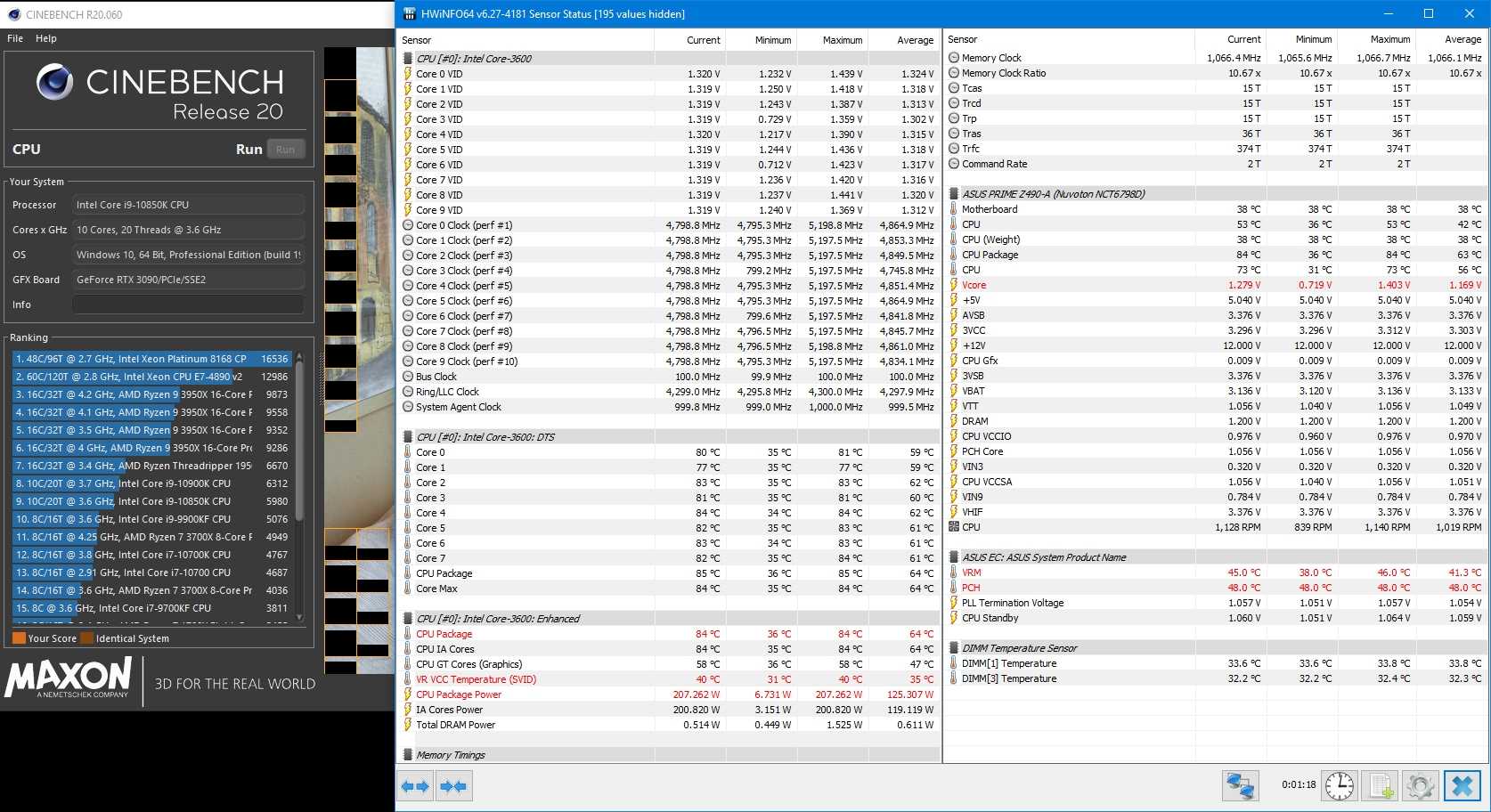 Пользуясь тем, что материнская плата ASUS Prime Z490-A по умолчанию разрешает превышать лимиты энергопотребления, процессор выполняет 3D-рендеринг в Cinebench R20 на полной турбо-частоте 4800 МГц с загрузкой всех 10 ядер. При этом фактическое энергопотребление Core i9-10850k в задаче подобного рода составляет внушительные 208 Вт, что, разумеется, далеко от паспортных значений. Однако рабочая температура Core i9-10850k остается в разумных пределах и за счет системы жидкостного охлаждения не превышает 84 градуса Цельсия.