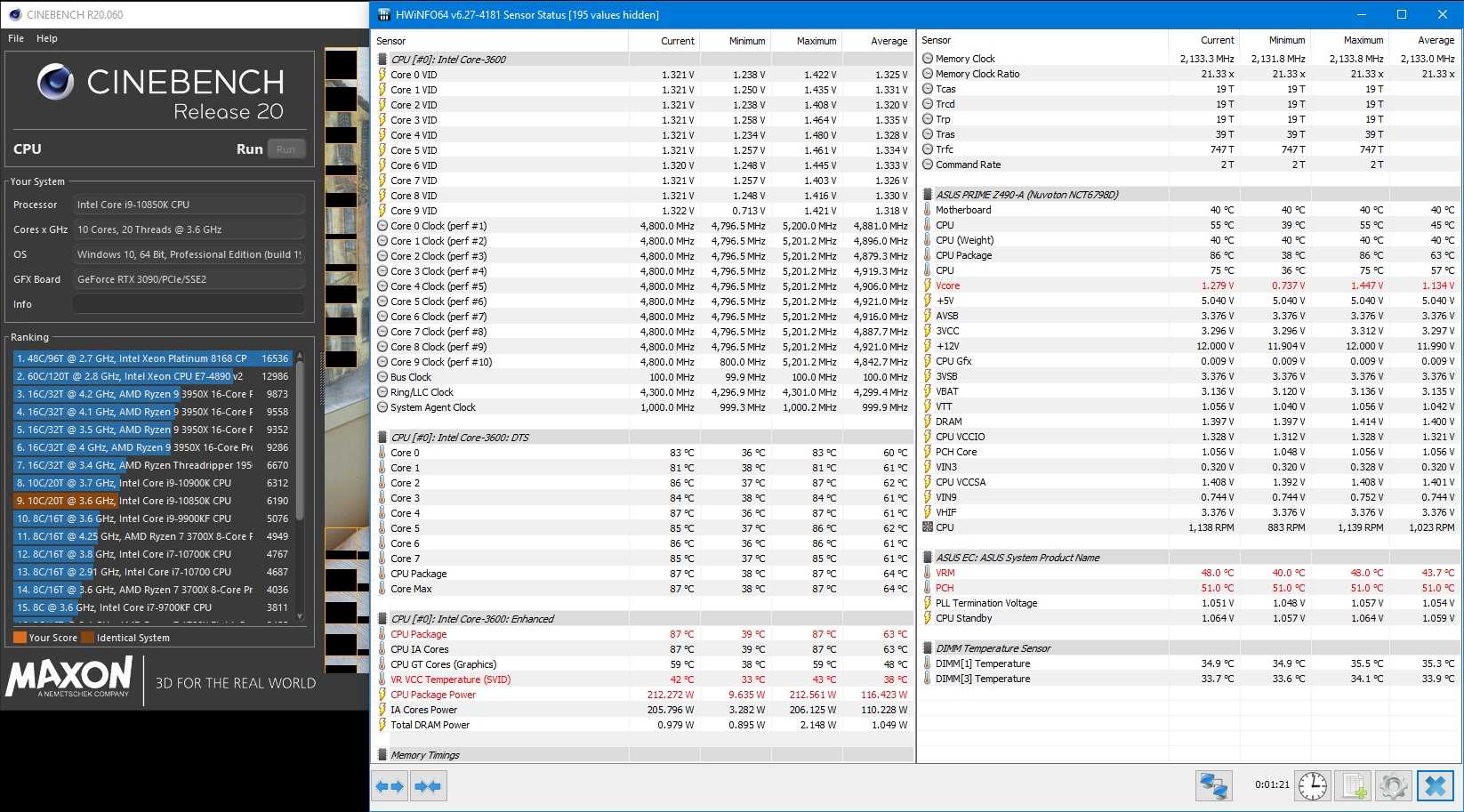 Как следствие, выполняя ту же работу в Cinebench R20, процессор Core i9-10850k уже потребляет 213 Вт и нагревается до 87 градусов Цельсия. При этом тактовые частоты ядер CPU на уровне максимального турбо-буста в 4800 МГц.
