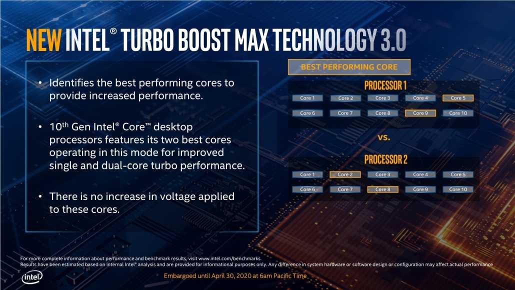 Вместе с этим Core i9-10850k сохранил все архитектурные и функциональные возможности флагманского Core i9-10900k. В первую очередь это — технологии Turbo Boost Max 3.0 и Thermal Velocity Boost , за счет которых Core i9-10850k может ускоряться до 4.8 ГГц при нагрузке на все 10 ядер и до 5.2 ГГц при нагрузке на 1 ядро.
