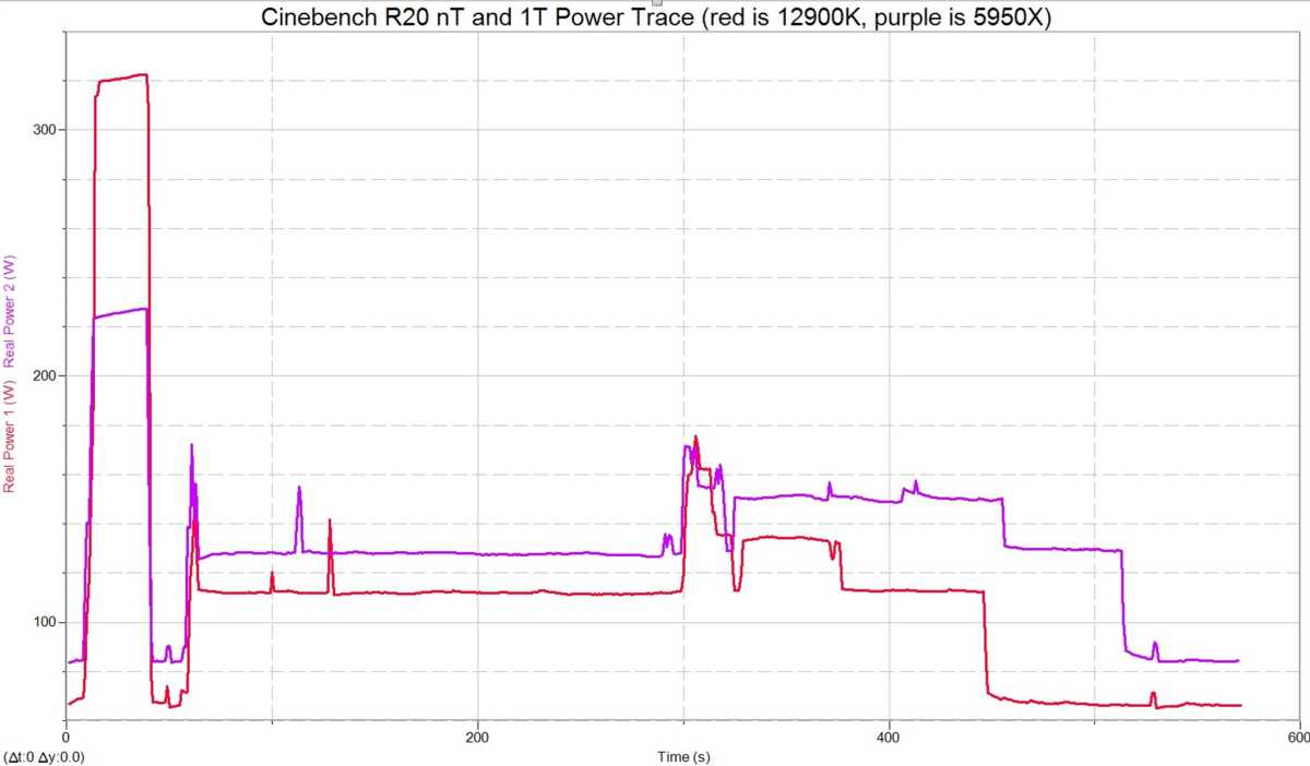 Total system power trace of the 12th gen Core i9-12900K and Ryzen 9 5950X while running Cinebench R20.