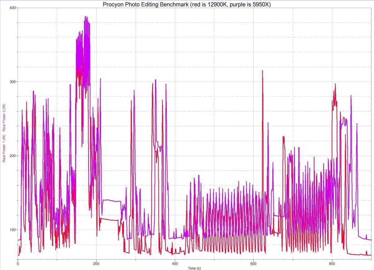 To see how it plays out in a more practical test, we then simultaneously recorded the power consumption of both systems while Procyon 2.0 is running Photoshop and Lightroom Classic. You can see the Ryzen 9 is actually using more power than the 12th gen Core i9 in both applications. The upshot is that yes, the 12th-gen Core i9 can indeed guzzle down the electricity, but in actual practical use, it tends to be fairly energy efficient.