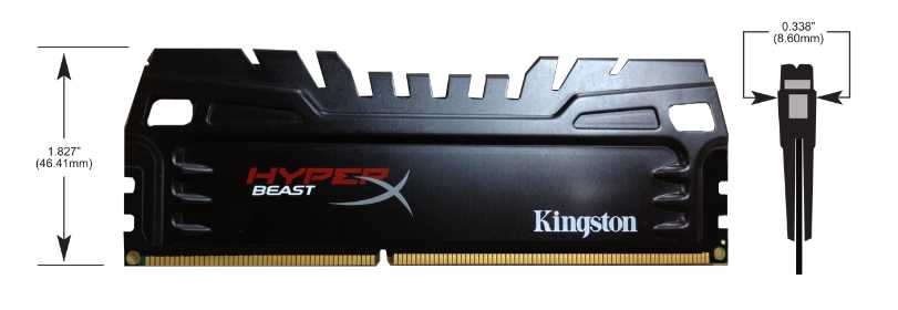 Габариты Kingston HyperX Beast представлены на фото ниже.  Радиаторы системы охлаждения контактируют с микросхемами оперативной памяти через термопрокладки. Снимаются радиаторы несложно – достаточно нагреть модуль памяти феном или печкой-обогревателем.