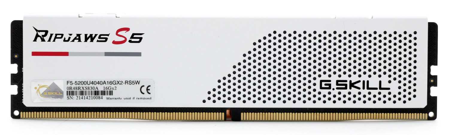 Новинка в лице комплекта G.Skill Ripjaws S5 DDR5 5200MHz 32Gb с индексом (F5-5200U4040A16GX2-RS5W) представляет набор из двух черных модулей, закованных в белоснежные радиаторы. Несмотря на младшее расположение в иерархии, над дизайном модели тщательно поработали. Всего представлено 4 комплекта, различающиеся только цветовой гаммой и таймингами CL36 и CL40.