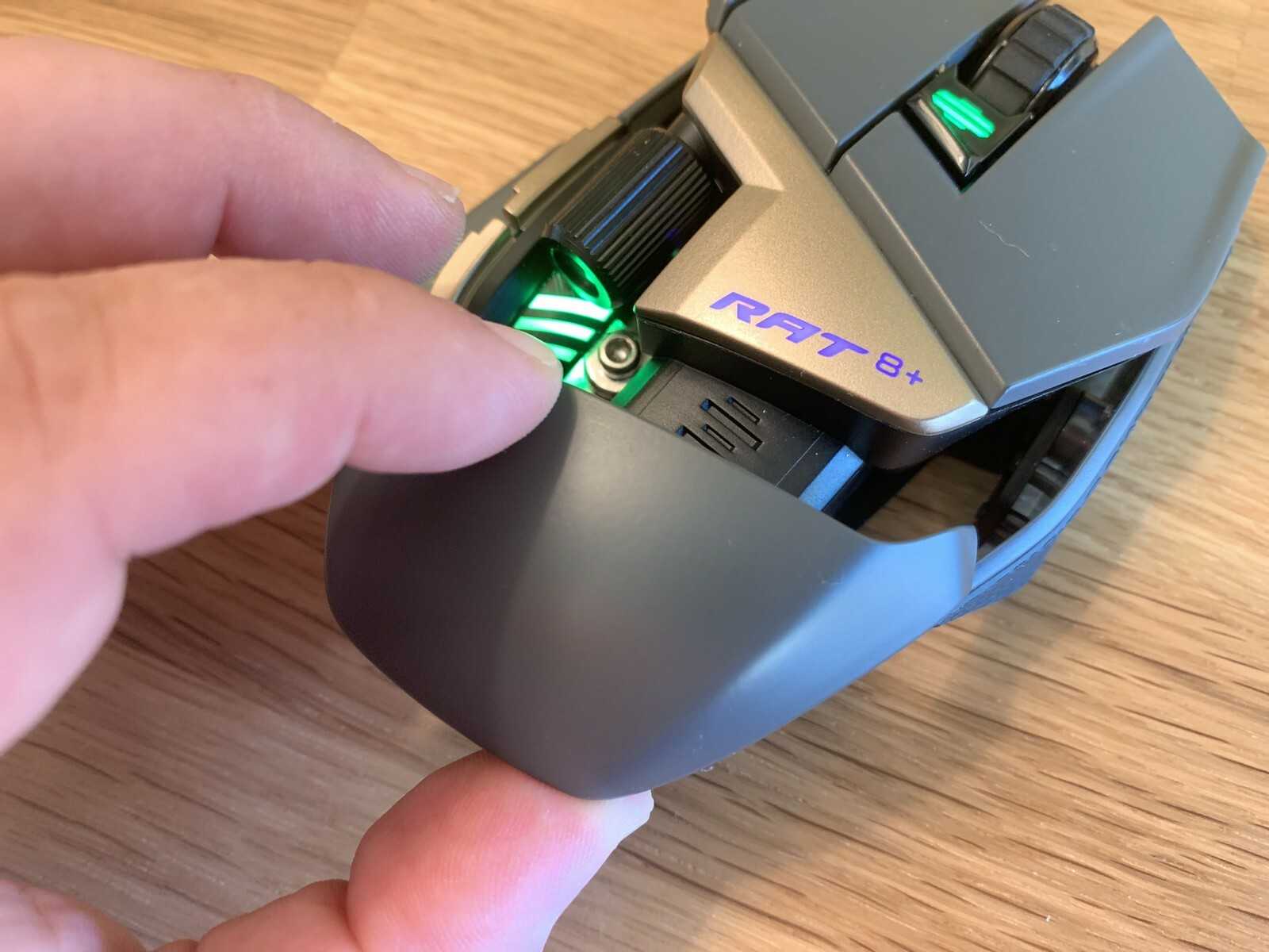And, yes, I did say that portions of the mouse’s base are «open.» It’s part of the R.A.T. 8+’s offbeat, robotic look. Instead of a single all-encompassing shell, the outer contours comprise four panels: the top button area (with the click panels and surrounding buttons), the thumb rest on the left side, a pinky rest on the right, and a palm rest at the base. There’s some space between each of these panels, which exposes springs, screws, and some of what would normally be interior housing. One of the three RGB lighting elements is inside, near the base of thumb rest, giving that inner space a funky glow.