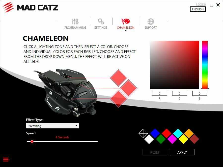 I do have a beef with the RGB lighting settings. The R.A.T. 8+ has three lighting elements: (1) a small icon on the switch just below the scroll wheel, (2) the name/logo in the center of the mouse, and (3) the striped light I mentioned earlier, found in the gap between the thumb and palm-rest panels. The software gives you a choice of only four lighting effects, which is relatively little sway to animate your color palette, which in contrast you can tweak extensively on an RGB basis.