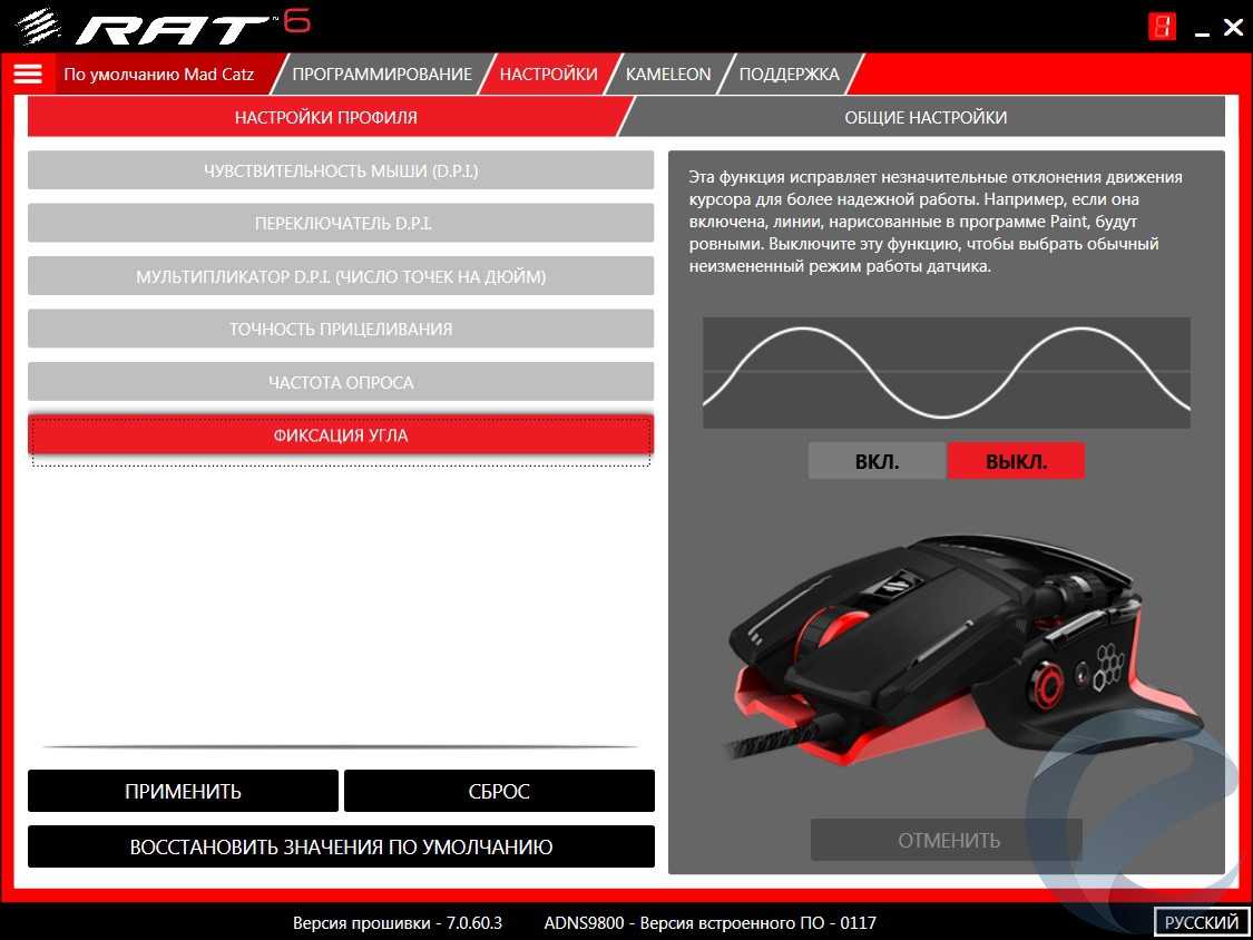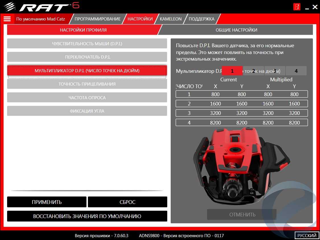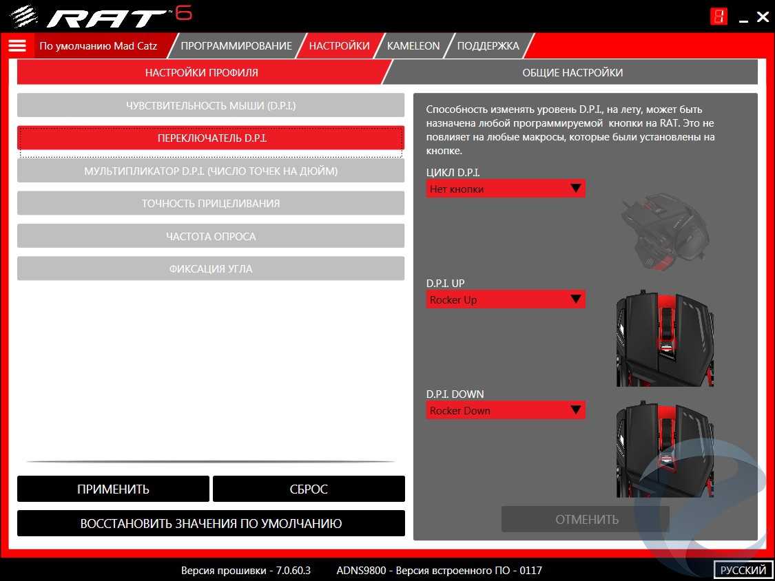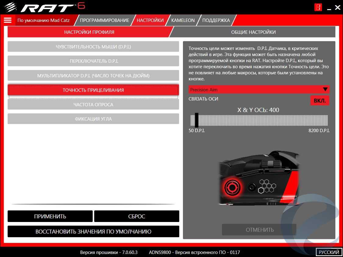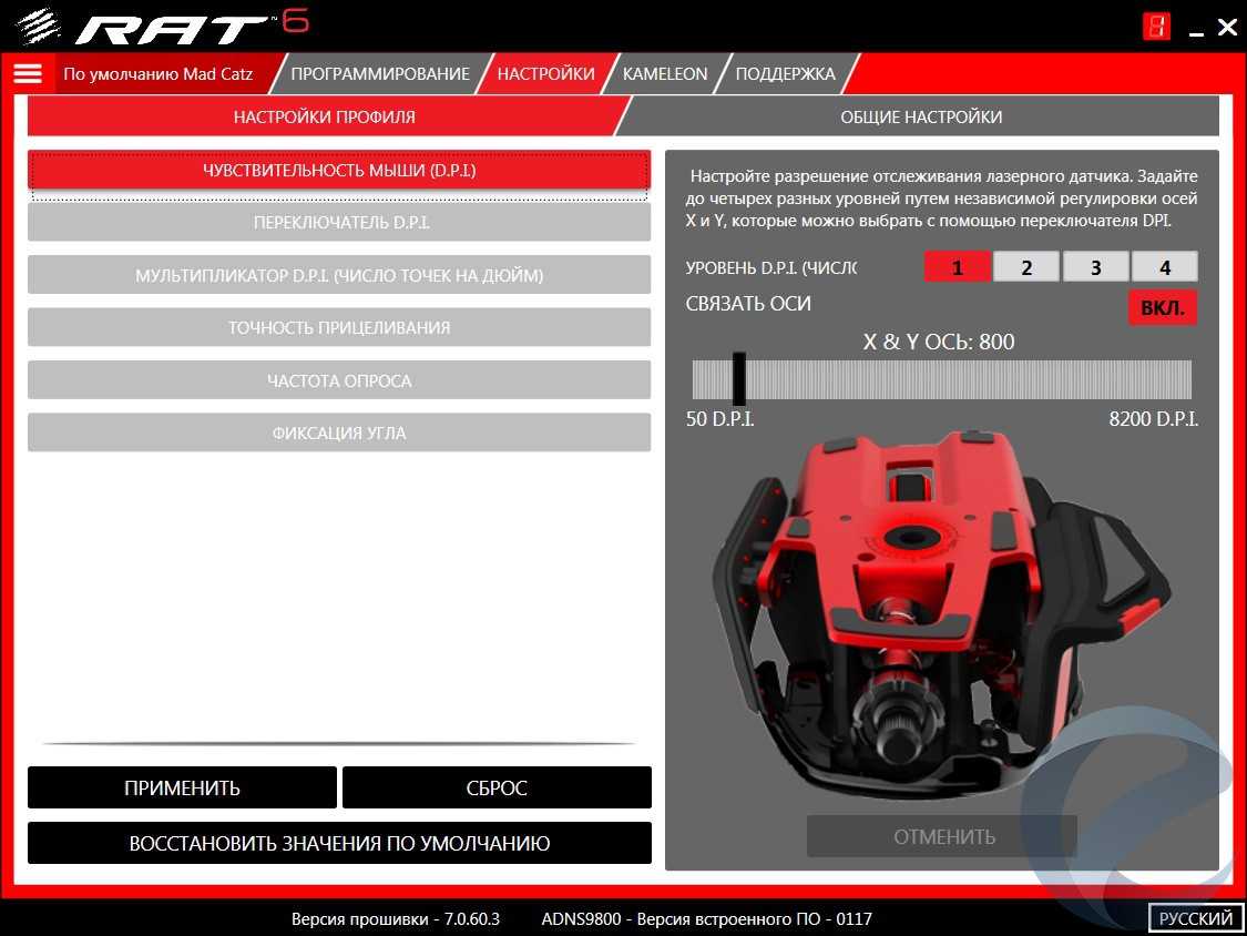 В настройках профиля регулируются основные параметры, связанные с чувствительностью мыши, переключением DPI, режимом снайперского огня и точностью прицеливания, частотой опроса и угловой привязкой. Из особенностей: широкий диапазон регулировки разрешения, в том числе раздельно по осям, с прикреплением к одному из четырех режимов, переключаемых «на лету» аппаратными кнопками. Изменение DPI назначается на любую из программируемых кнопок, при этом на неё же можно параллельно повесить какой-нибудь макрос.