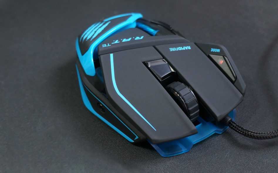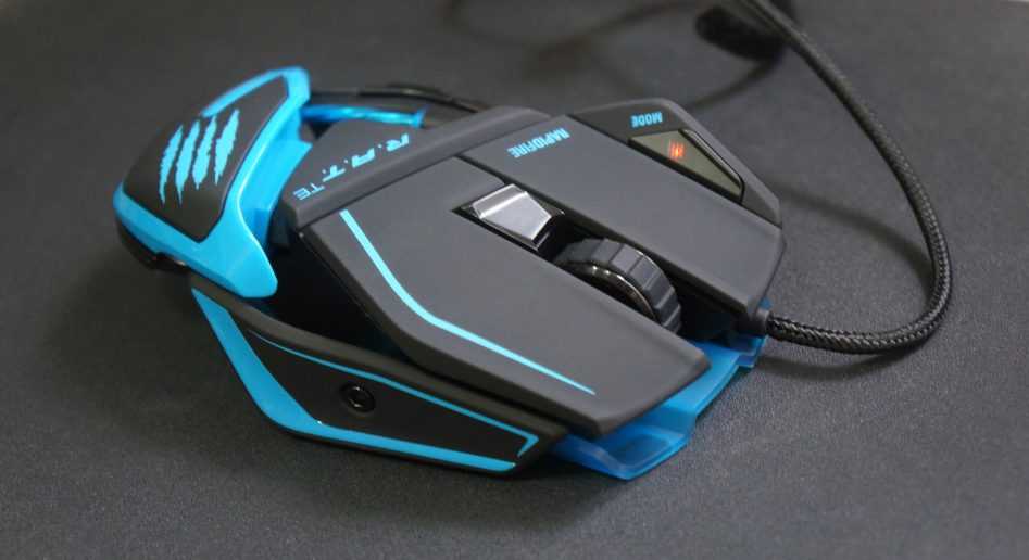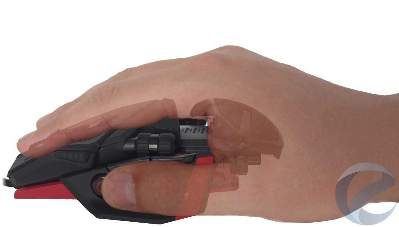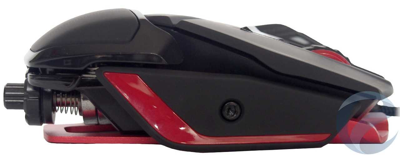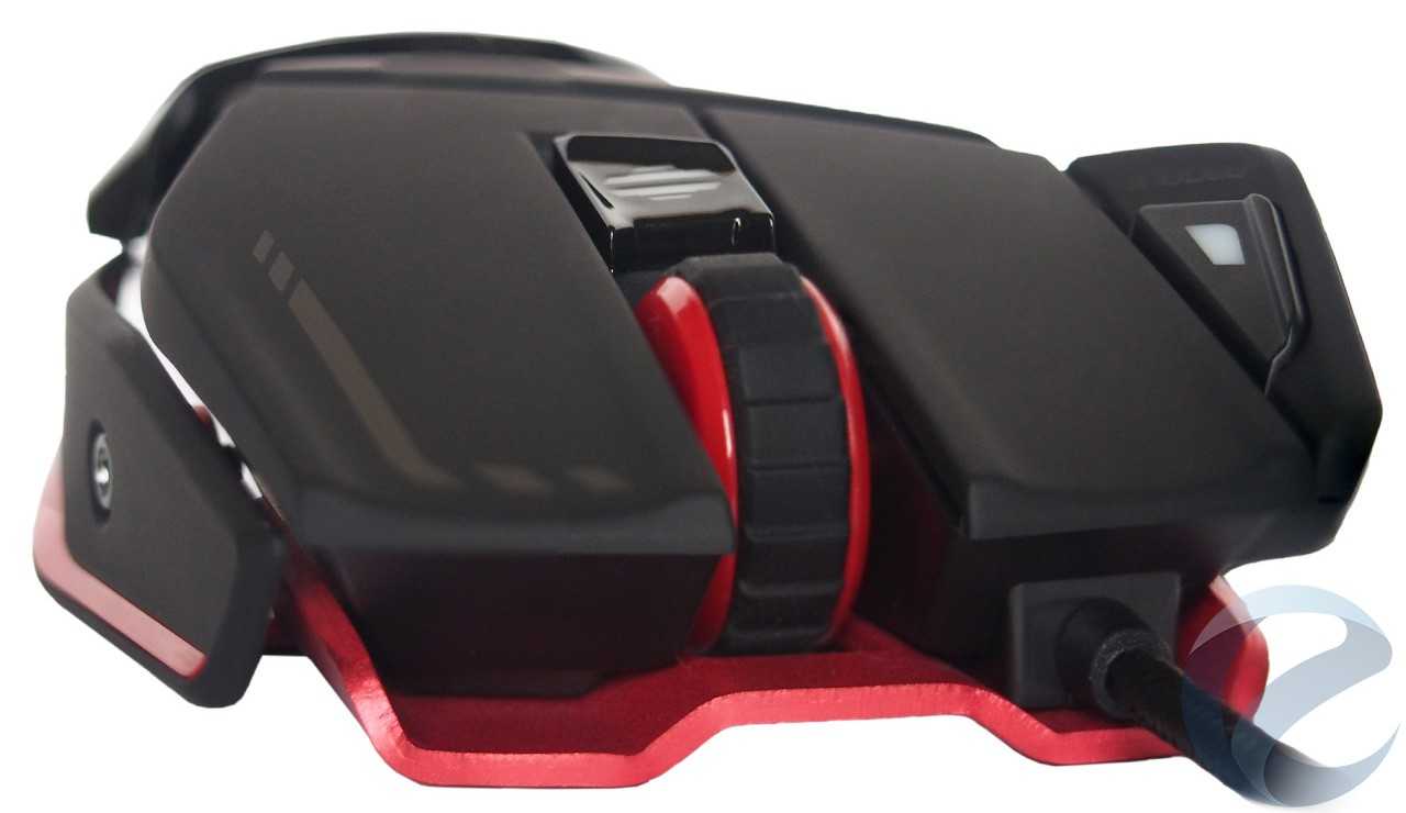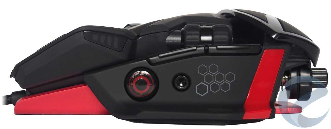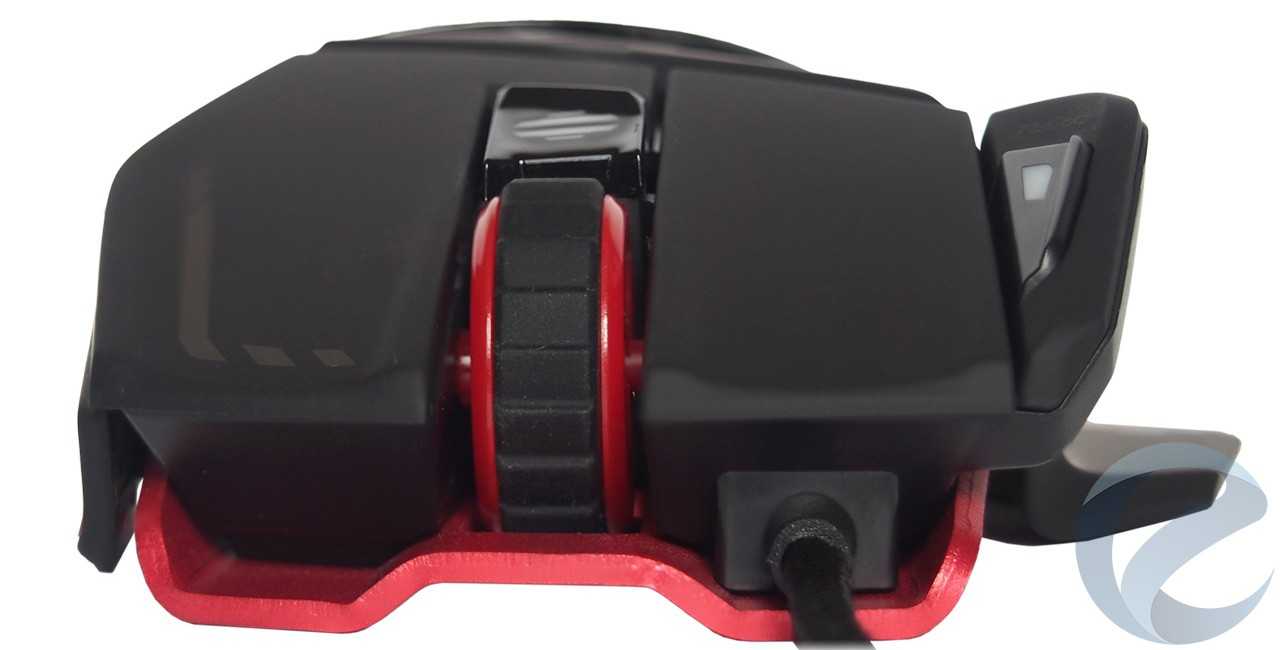 Кнопка MODE находится слева, она по умолчанию позволяет переключаться между тремя профилями мыши. Логотип Mad Catz на кнопке горит одним из трёх цветов (красным, синим или фиолетовым) и отражает активный профиль.