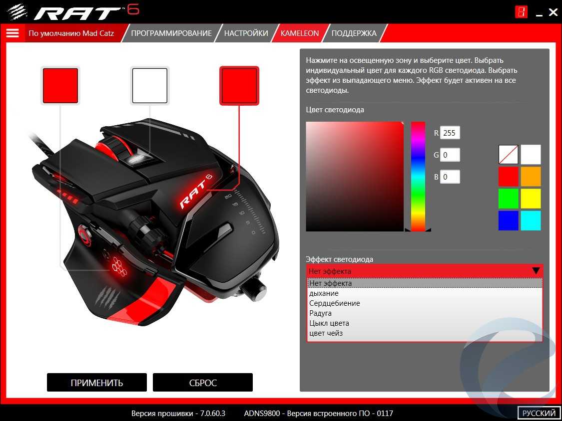 Подсветка нескольких зон присутствует, меняется в зависимости от текущего профиля настроек. По умолчанию цвет переключается между несколькими заранее заданными значениями, в следующей последовательности: пульсация красного, затем постоянное свечение красного, голубого и пурпурного. Предустановки можно сменить через специальную утилиту, о чем ниже. Одинаковым цветом горят: зона на подставке для большого пальца, надпись RAT 6 в зоне хвата ладонью и кнопка смены DPI. Яркость подсветки подобрана неплохо, днем визуально заметна и ночью не бьет в глаза. Кроме того на одной из дополнительных кнопок разместили четырех сегментный индикатор режима DPI. Его цвет не меняется, расположение удачное, рукой не перекрывается и всегда на виду.
