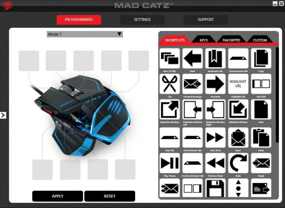 Меню PROGRAMMING делится на две части, в левой находится переключатель режима и изображена мышь с обозначениями кнопок и команд, а в правой расположено меню команд. К кнопкам можно привязывать различные команды вроде копирования и вставки, а также клавиатурные сочетания.