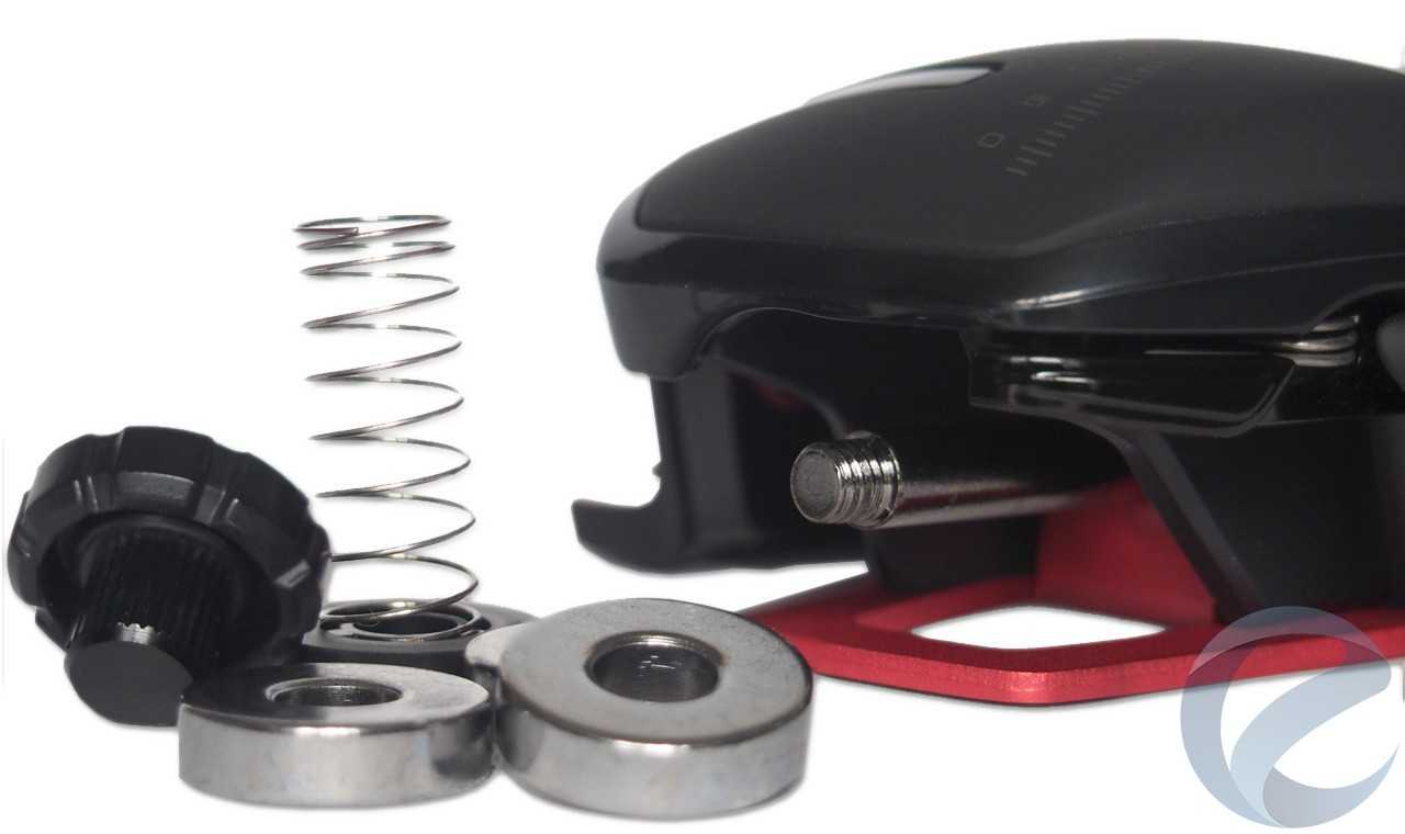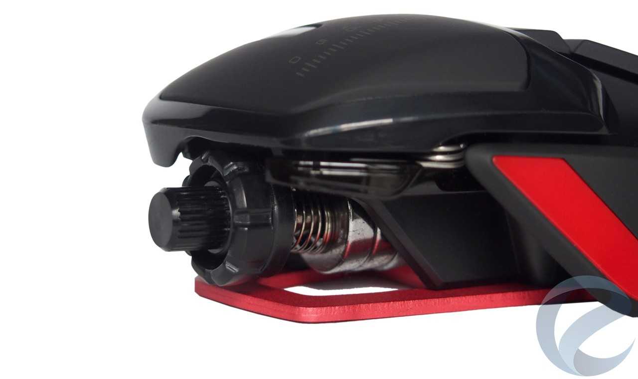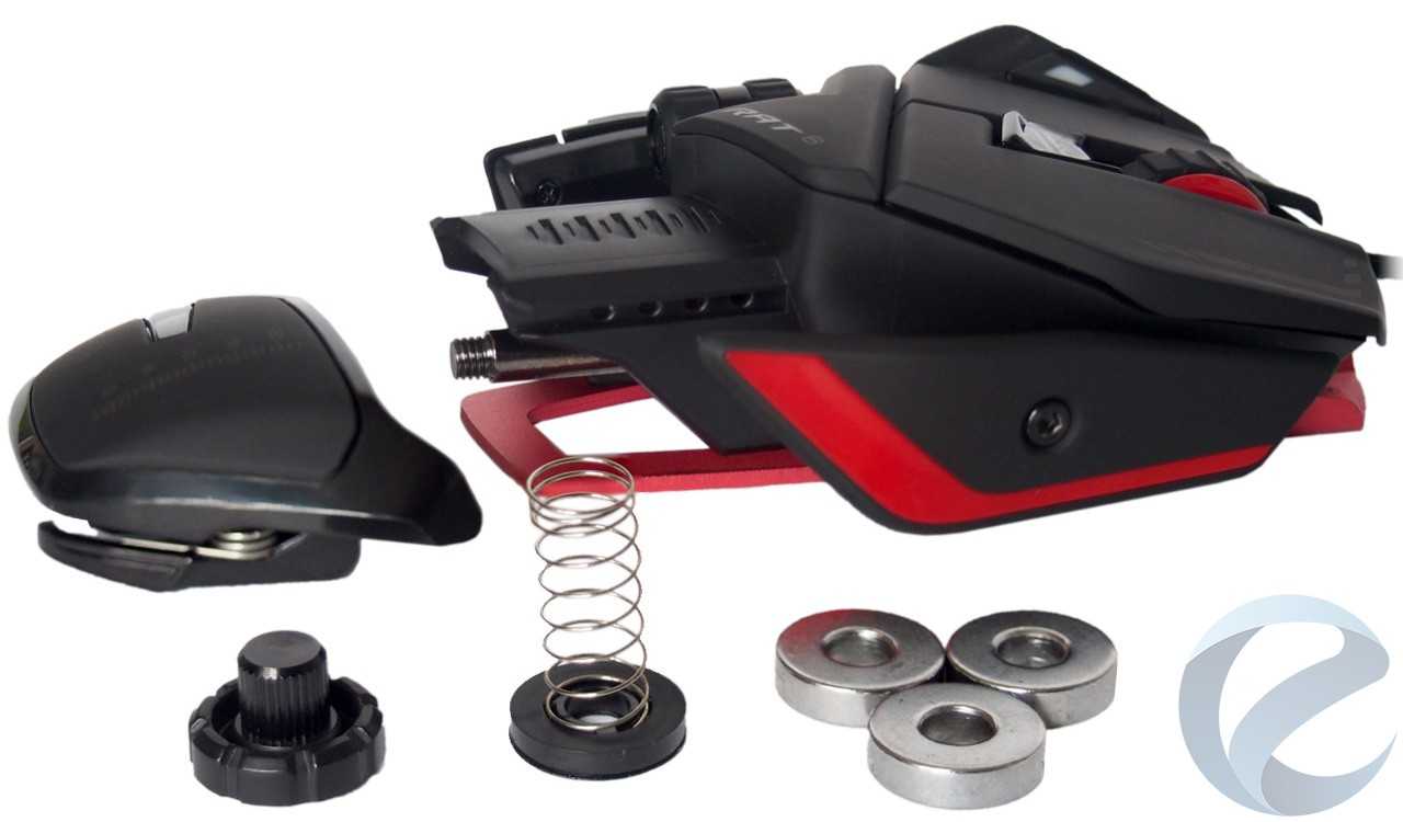 Несмотря на наличие металлического каркаса в основании, за счет применения алюминиевого сплава, общий вес мышки укладывается в 120 грамм. При этом в руке мышь кажется более легкой, чем есть на самом деле, вероятнее всего обман органов восприятия вызван свободными областями между панелями. Немного скорректировать значение веса можно с помощью грузиков, закрепленных в задней части корпуса. Они зафиксированы на специальной оси и прижаты подпружиненной пластиковой шайбой. Меняя направление установки пружины и расположение грузиков, можно добиться небольшого сдвига центра тяжести к задней части мышки.
