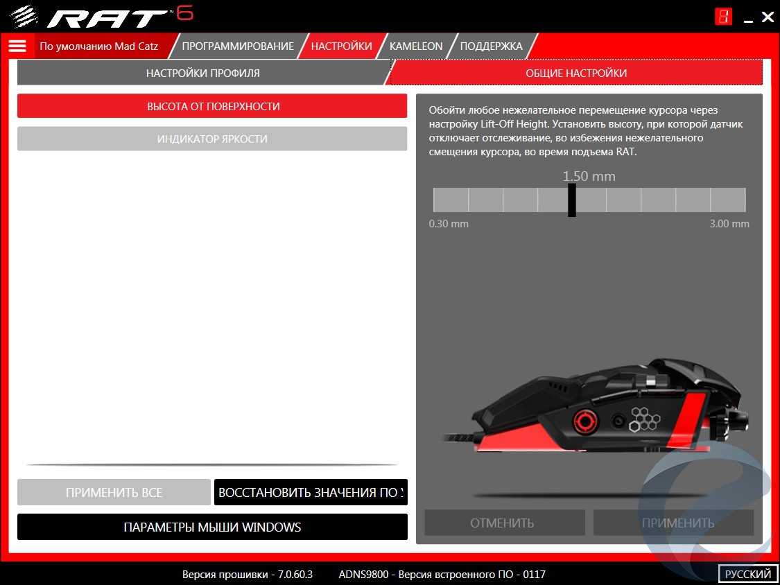 Lift-Off Height определяет высоту над рабочей поверхностью, при которой сенсор будет отключаться. Mad Catz рекомендует 0,2 мм для гладких и металлических покрытий, 0,35 мм для силиконовых ковриков или слабо текстурированных поверхностей и 0,5 мм для ткани.