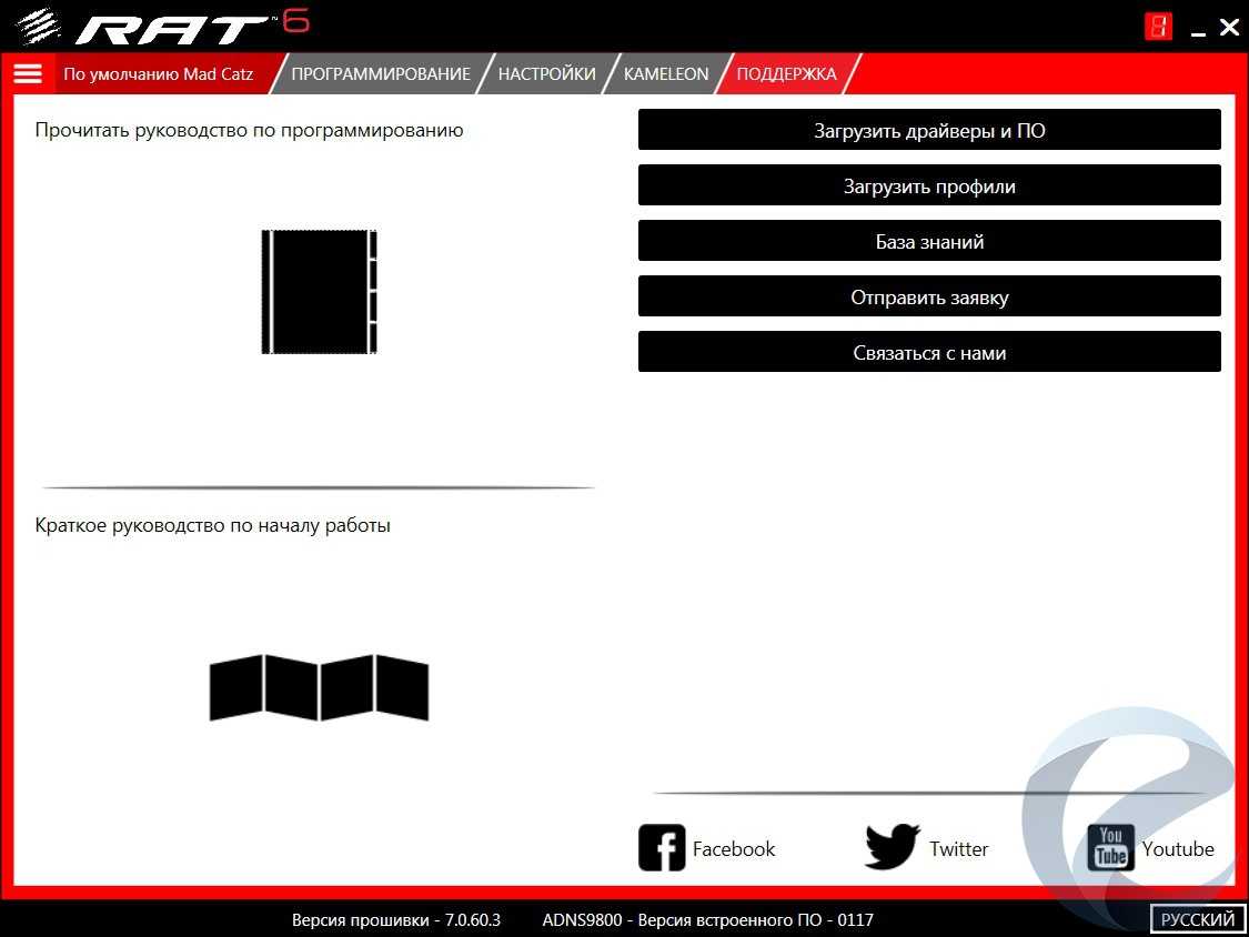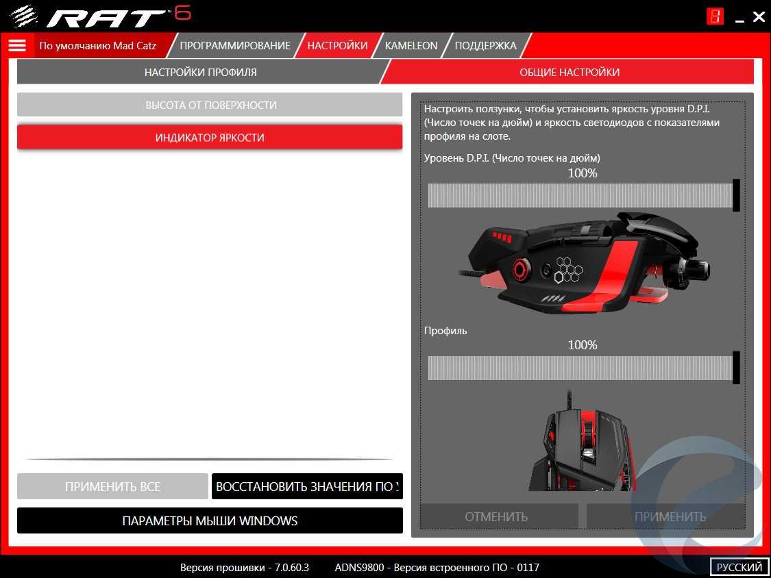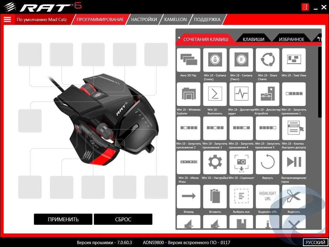 Все дополнительные элементы управления, за исключением бокового колеса, в зоне упора большого пальца, работают со стандартным драйвером HID-совместимых устройств. Для детального же управления настройками мыши MAD CATZ RAT 6 используется фирменное программное обеспечение и драйвер (для 32 и 64 битных операционных систем Microsoft Windows версий 7, 8, 8.1 и 10), доступные для загрузки на сайте производителя в разделе Downloads — Drivers&Software. При первом запуске ПО происходит обновление прошивки манипулятора, в ходе которого устанавливается драйвер сервисного режима MadCatz (Said506F), требующий подтверждения доверия к издателю. На момент написания обзора актуальная версия встроенного ПО 1.17