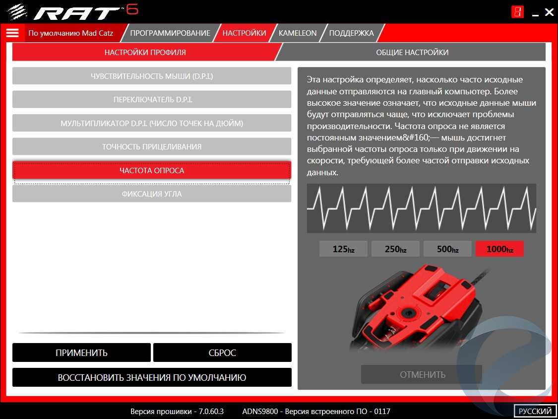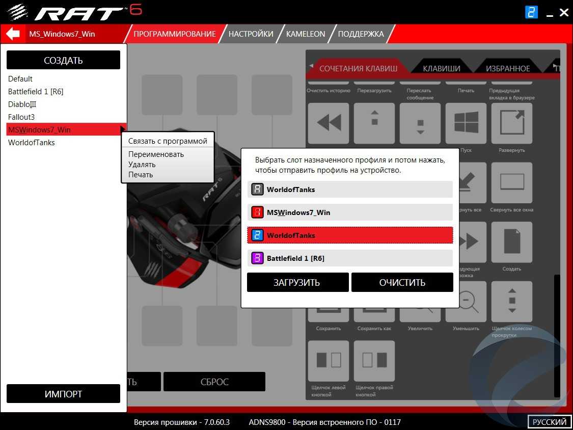 После успешного обновления открывается основное окно программы с полной русификацией доступных действий (язык можно выбрать в нижнем правом углу). В функционал утилиты RAT 6, в отличие от ПО многих других производителей, входит не просто абстрактная поддержка профилей, по принципу «сделай сам», но и прилагается коллекция настроек (доступна к загрузке в разделе драйверов)для популярных игр. Импортировав их в программу, можно, не углубляясь в дебри настроек, сразу получить удобные пресеты для многих современных игр.
