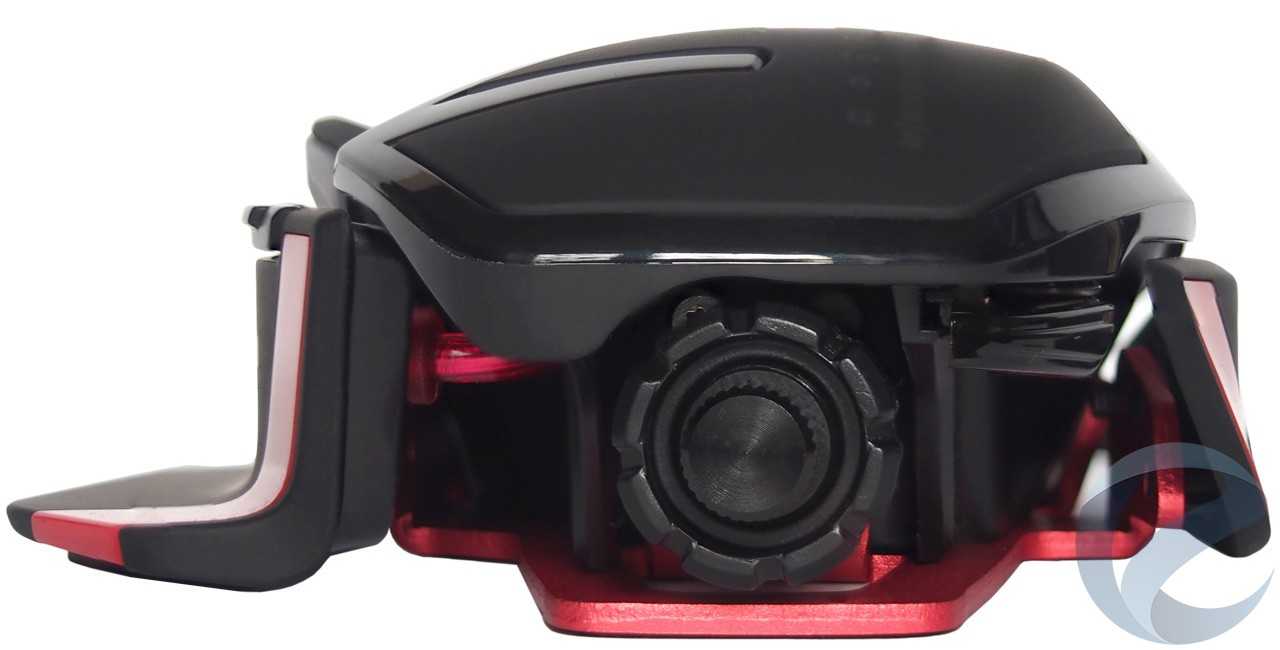 В основе корпуса лежит алюминиевая рама, выкрашенная в красный цвет. На нее закреплены все компоненты мышки, начиная от панелей и соединительных элементов корпуса, и заканчивая электронной начинкой. Панели корпуса из пластика, покрытого soft-touch покрытием с приятной фактурой. Их поверхность не маркая, отпечатки пальцев и следы от прикосновения рук заметны, но не сильно. Верхняя часть мыши выполнена в виде эргономичных зон, с широкими цельнолитыми основными (правой и левой) кнопками, областью колеса прокрутки и дополнительной кнопки переключения профиля слева. Перед началом использования нужно снять круглую защитную наклейку на дне (с надписью «remove before use»), прикрывающую линзу лазерного сенсора. Последняя, к слову, развернута на 90 градусов (ориентация слева направо). На дне расположены 6 тефлоновых площадок (5 на металлической раме и 1 на подставке для большого пальца), гладкая поверхность которых обеспечивает уверенное скольжение на любых распространенных поверхностях.