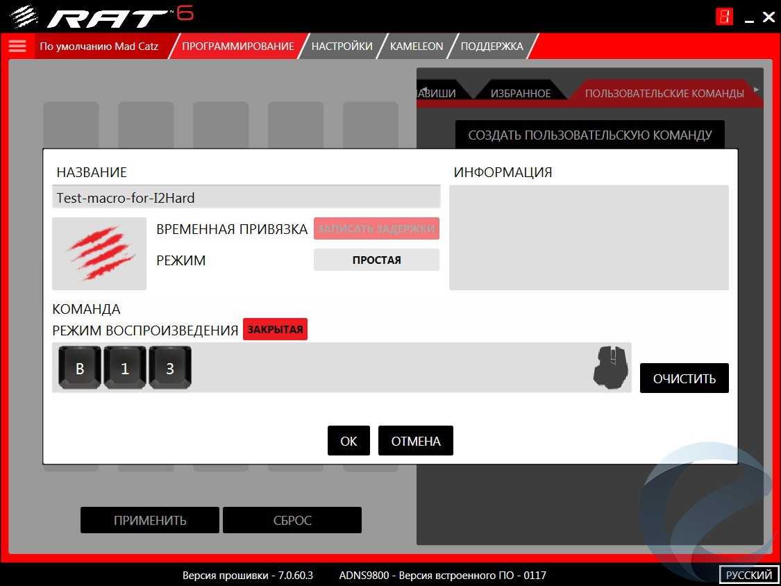При желании каждый программируемый элемент мыши настраивается отдельно. Доступных заготовок действий очень много, кроме того присутствует редактор макросов, позволяющий назначить на кнопки мыши последовательности нажатий кнопок на клавиатуре. Прикрепление любого действия к одному из 11 программируемых элементов выполняется простым перетаскиванием квадратика действия в соответствующий слот на изображении.