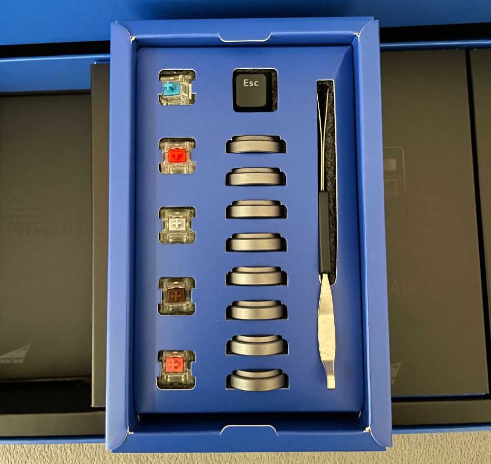 Of course, we’re also identifying each item inside the box here in our Mountain Everest Max Keyboard review. Aside from the keyboard, you’ll find a keycap + switch combo removal tool, a USB-C to C cable, and riser feet. There’s also a USB-A to C cable, five additional Cherry MX switches, and an extra ESC keycap.