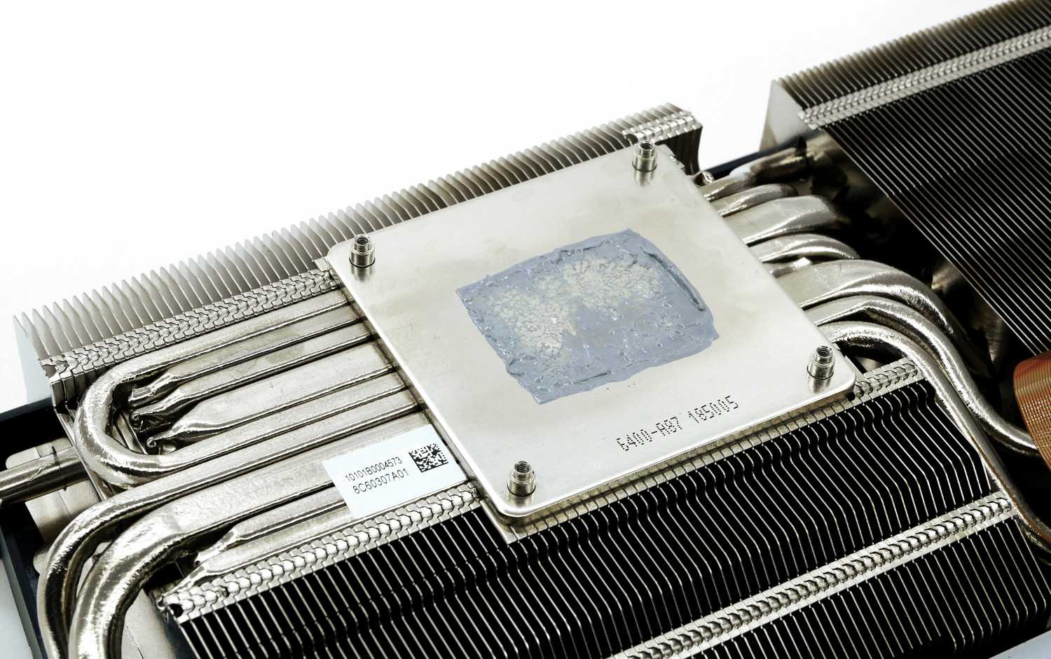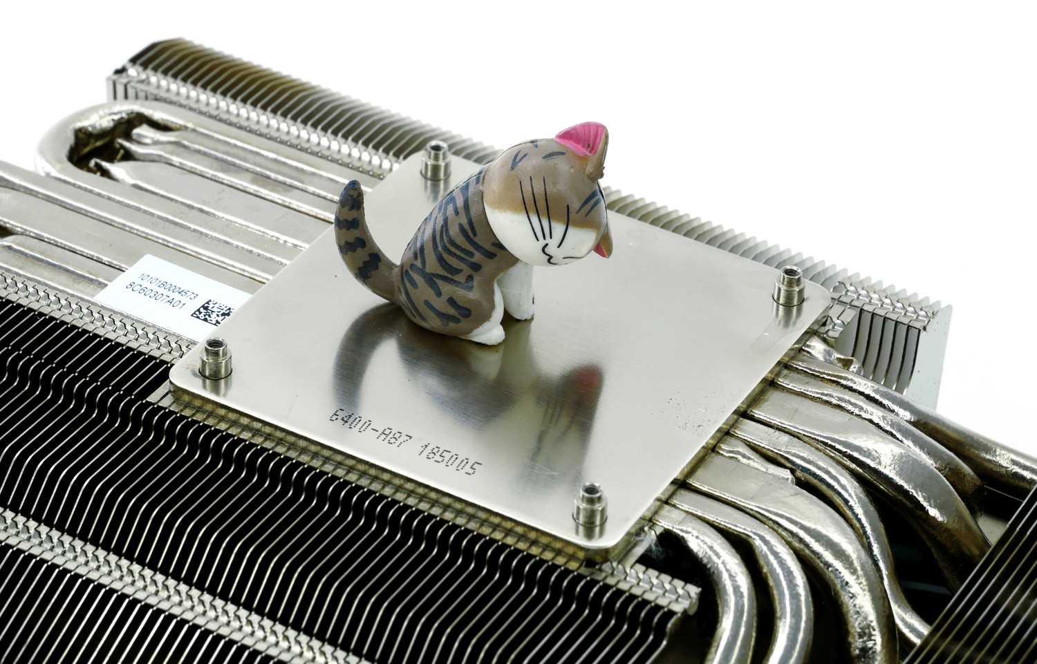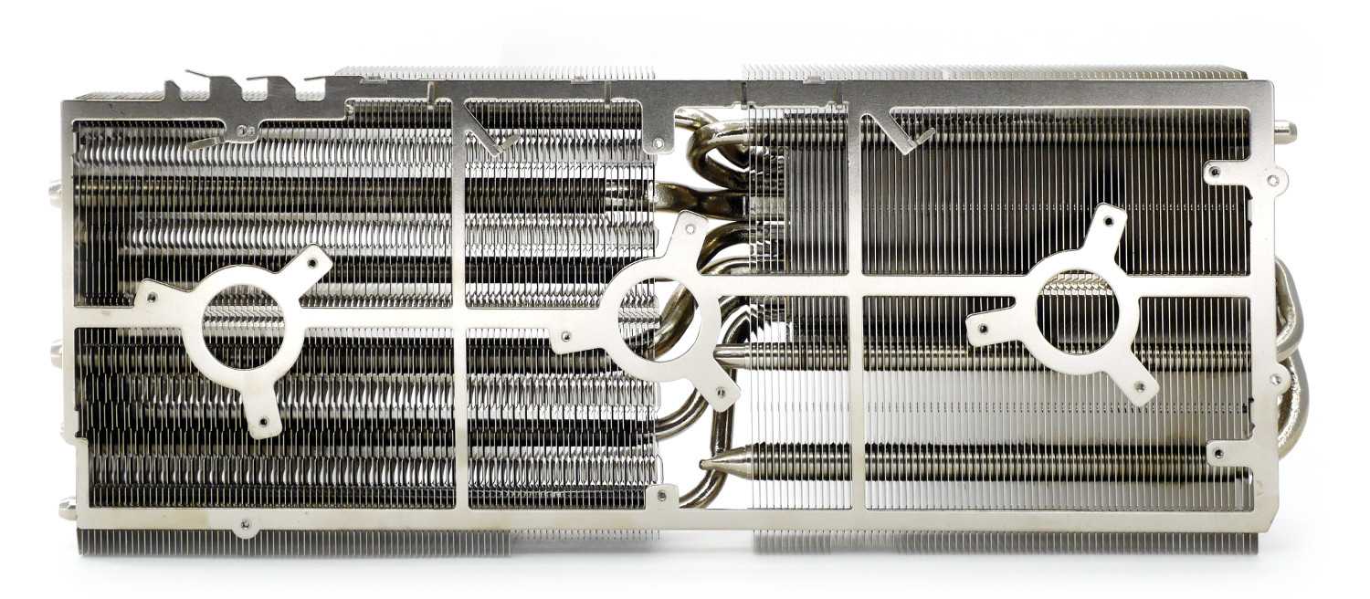 Охладитель представляет собой массивный двухсекционный радиатор, набранный 95 и 74 алюминиевыми пластинами волнистой формы и специальными выемками Airflow Control. Все элементы тщательно пропаяны для повышения эффективности теплоотвода. Кулер пронизывают две тепловые трубки диаметром 10 мм и шесть тепловых трубок диаметром 6 мм по формуле (6+6+10+6+6+10+6+6).