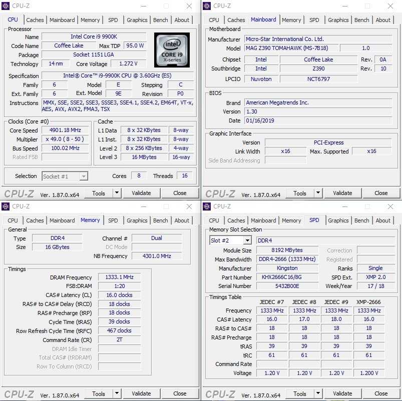 Сомневаться, что эта материнская плата способна работать в паре с Intel Core i9-9900K в стоке, не приходится и поэтому мы сразу перешли к разгону в довольно щадящем режиме. Наш Intel Core i9-9900K без проблем работает на частоте 4.9 ГГц при напряжении 1.330В и MSI MAG Z390 Tomahawk в таком режиме сохраняет полную стабильность системы.