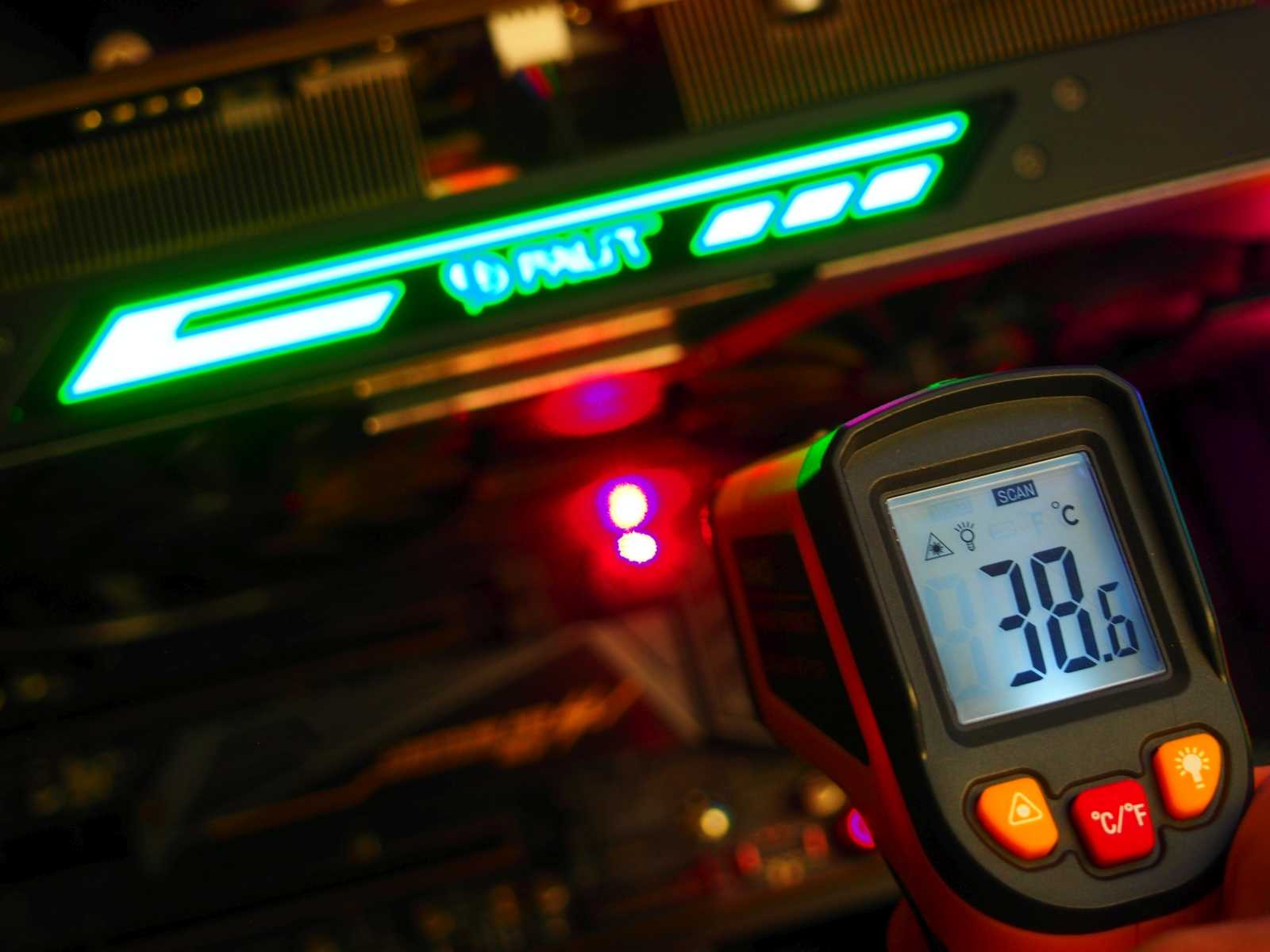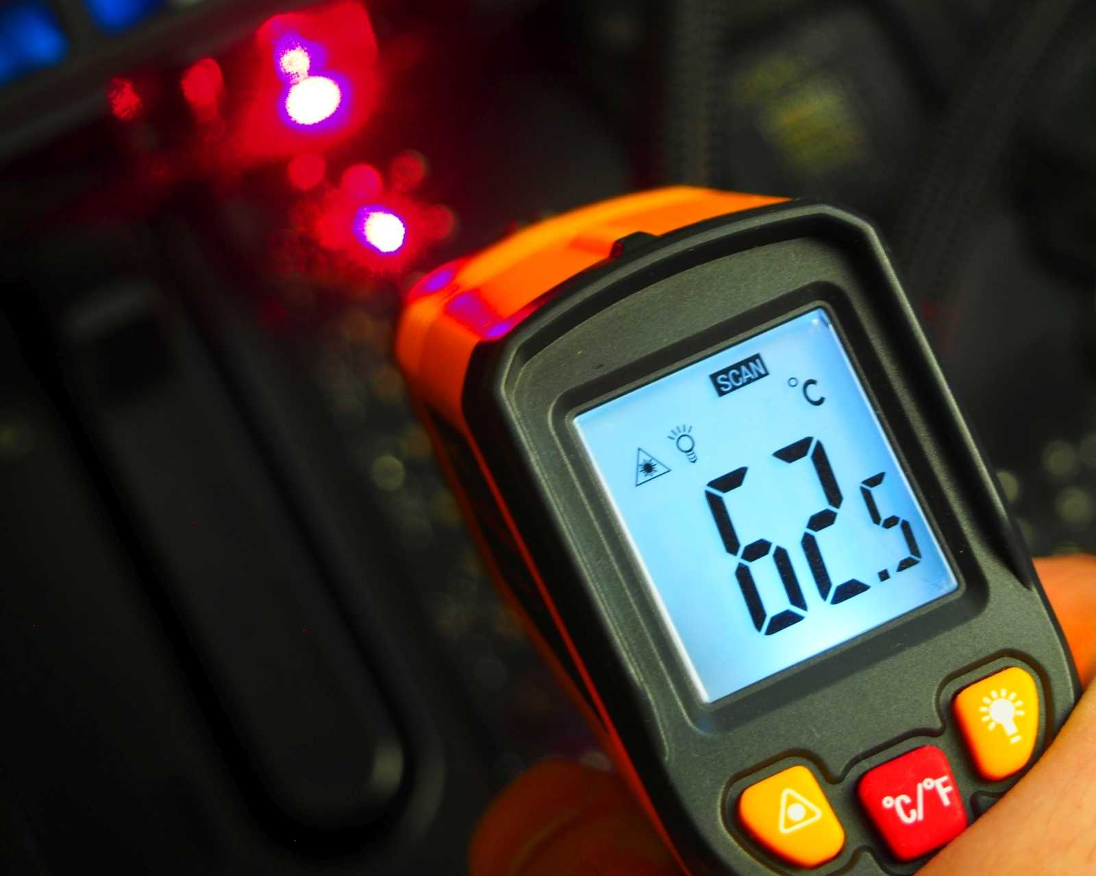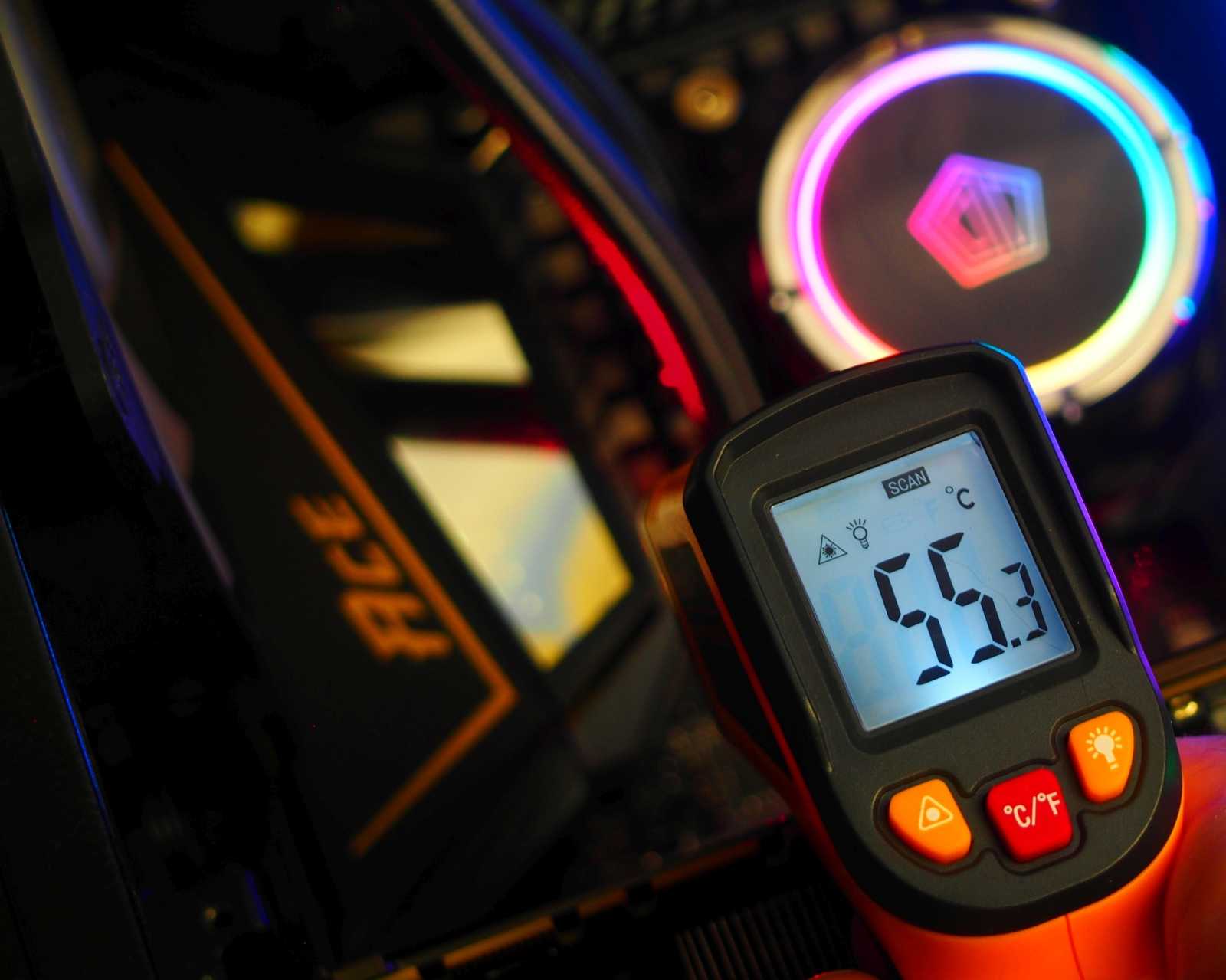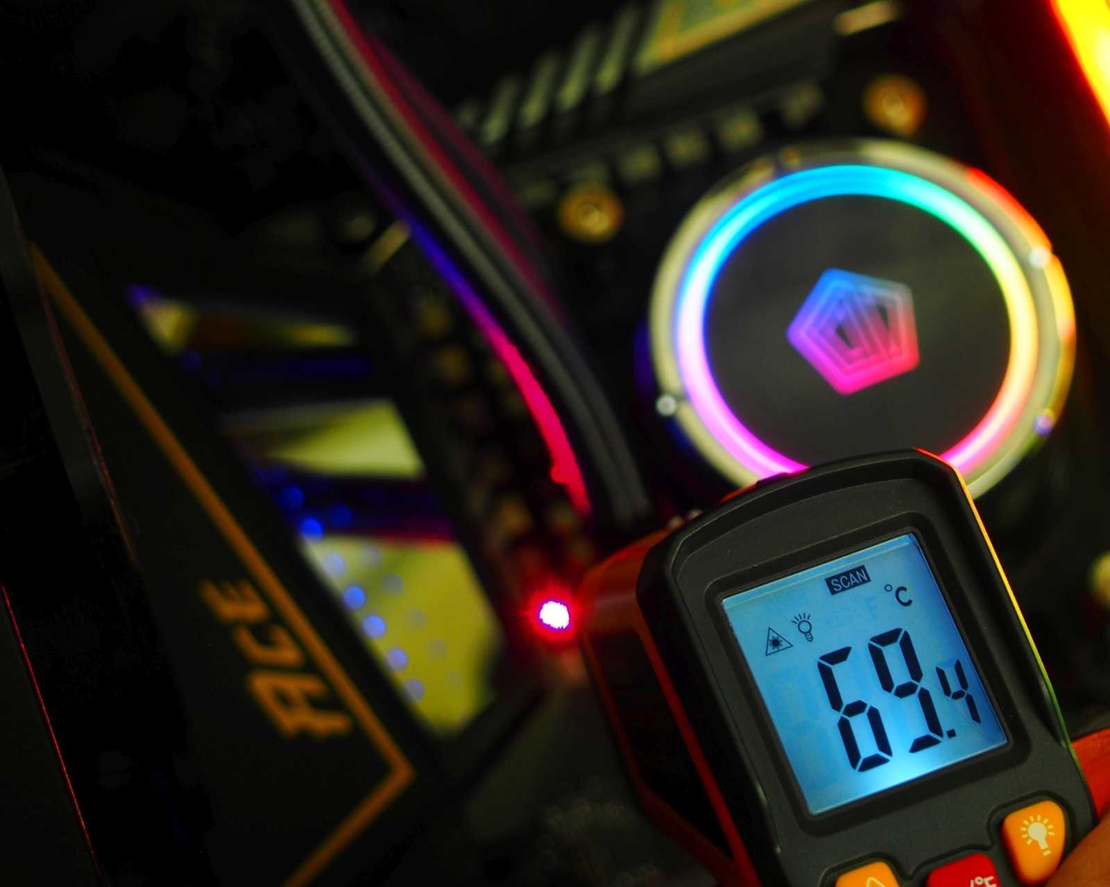 Проверить данные по нагреву VRM было необходимо для большей точности. Поэтому с помощью пирометра были найдены две наиболее горячие точки с лицевой и тыльной стороны MEG X570 ACE. Температура на них по показаниям пирометра составила 55,3°С и 62,5°С. Поэтому можно говорить о том, что рапортуемая датчиком температура VRM в 69°С соответствует реальной картине.