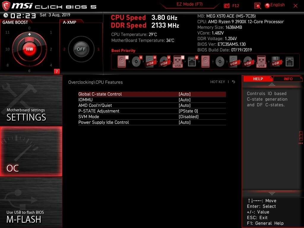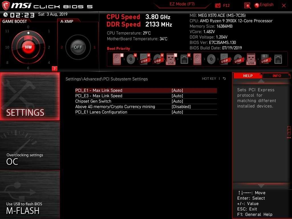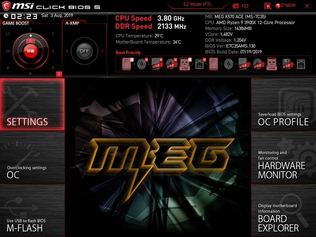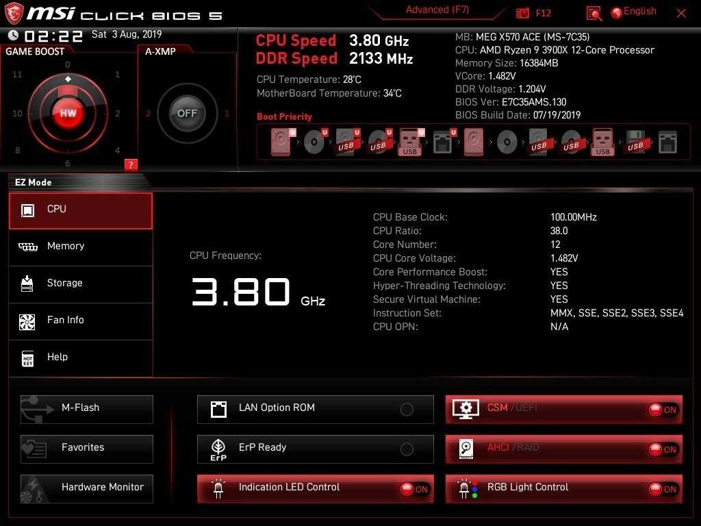 Настройки BIOS материнской платы MEG X570 ACE оформлены в приятную оболочку Click BIOS 5. Интерфейс настроек представлен в базовом и расширенном виде. Для перехода к полному перечню настроек необходимо нажать клавишу F7.