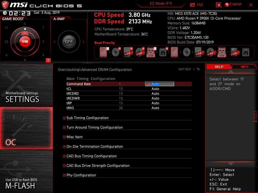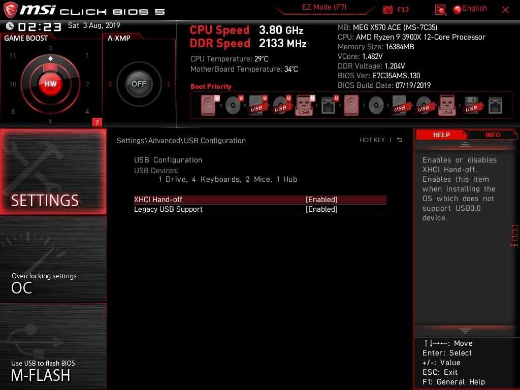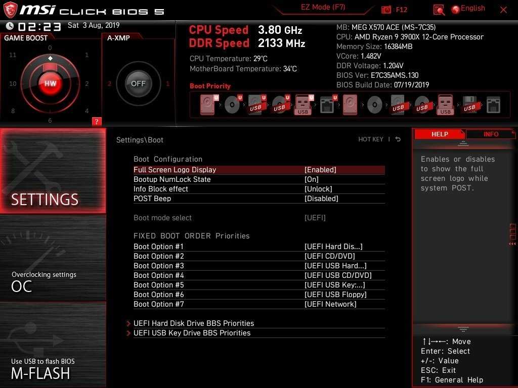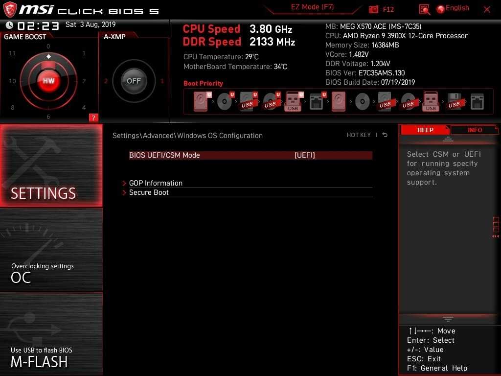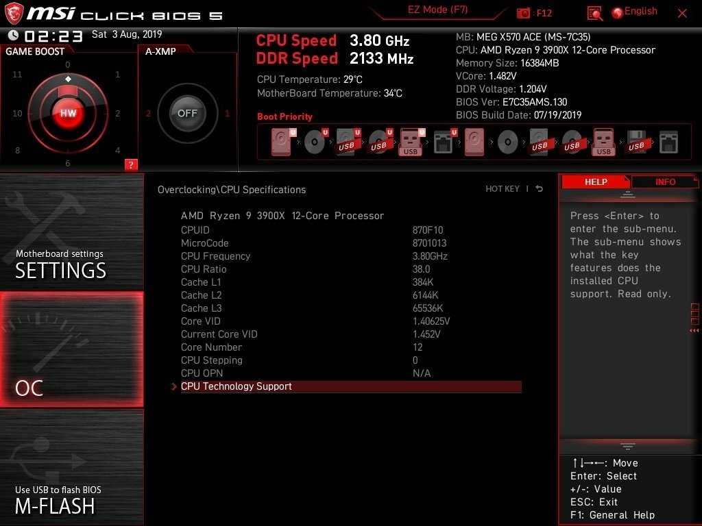 Настройки BIOS материнской платы MEG X570 ACE оформлены в приятную оболочку Click BIOS 5. Интерфейс настроек представлен в базовом и расширенном виде. Для перехода к полному перечню настроек необходимо нажать клавишу F7.