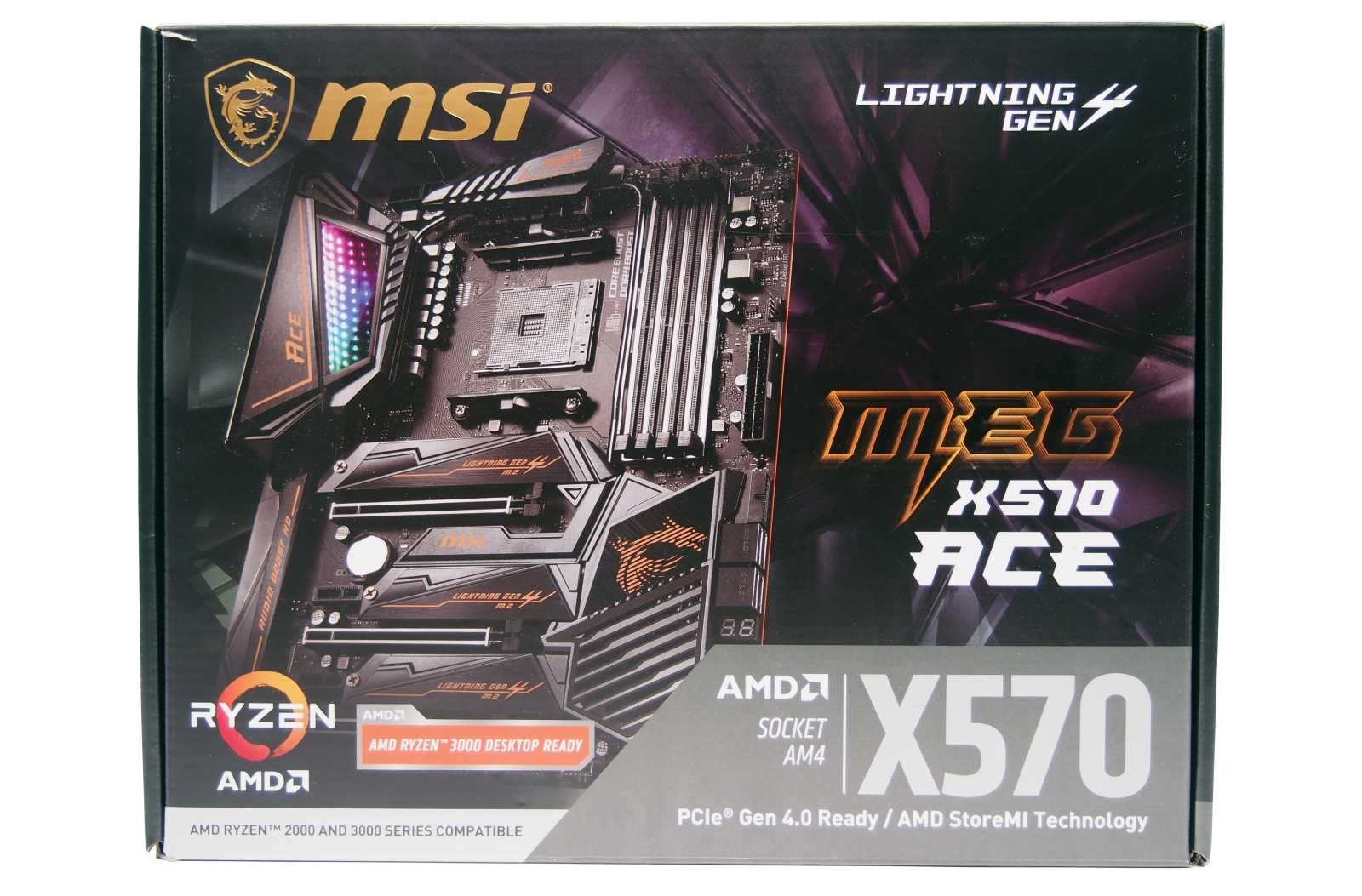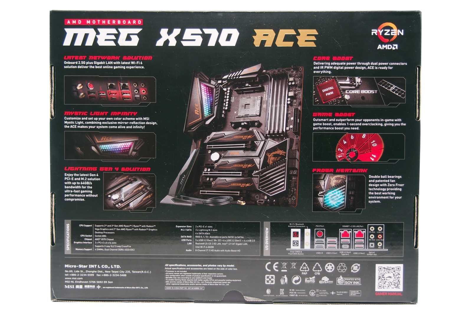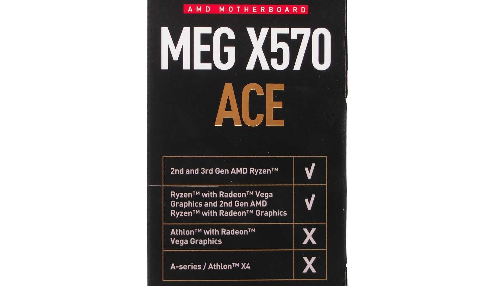 На лицевой грани картонной коробки MEG X570 ACE производитель сразу делает акцент на готовности продукта работать с процессорами Ryzen 3000-й серии. Больше половины фронтальной панели занимает изображение материнской платы, крупными буквами обозначен чипсет AMD X570.