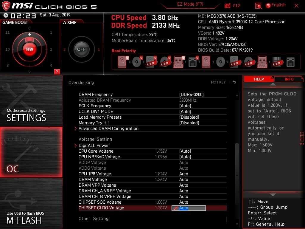 При тестировании материнской платы MEG X570 ACE ключевое внимание нам хотелось уделить вопросу охлаждения ее VRM, чипсета, при условии использования 12-ядерного Ryzen 9 3900X. Первый тест с нагрузкой всех 12-ядер процессора программой Prime95 мы провели на дефолтных настройках BIOS платы MEG X570 ACE.