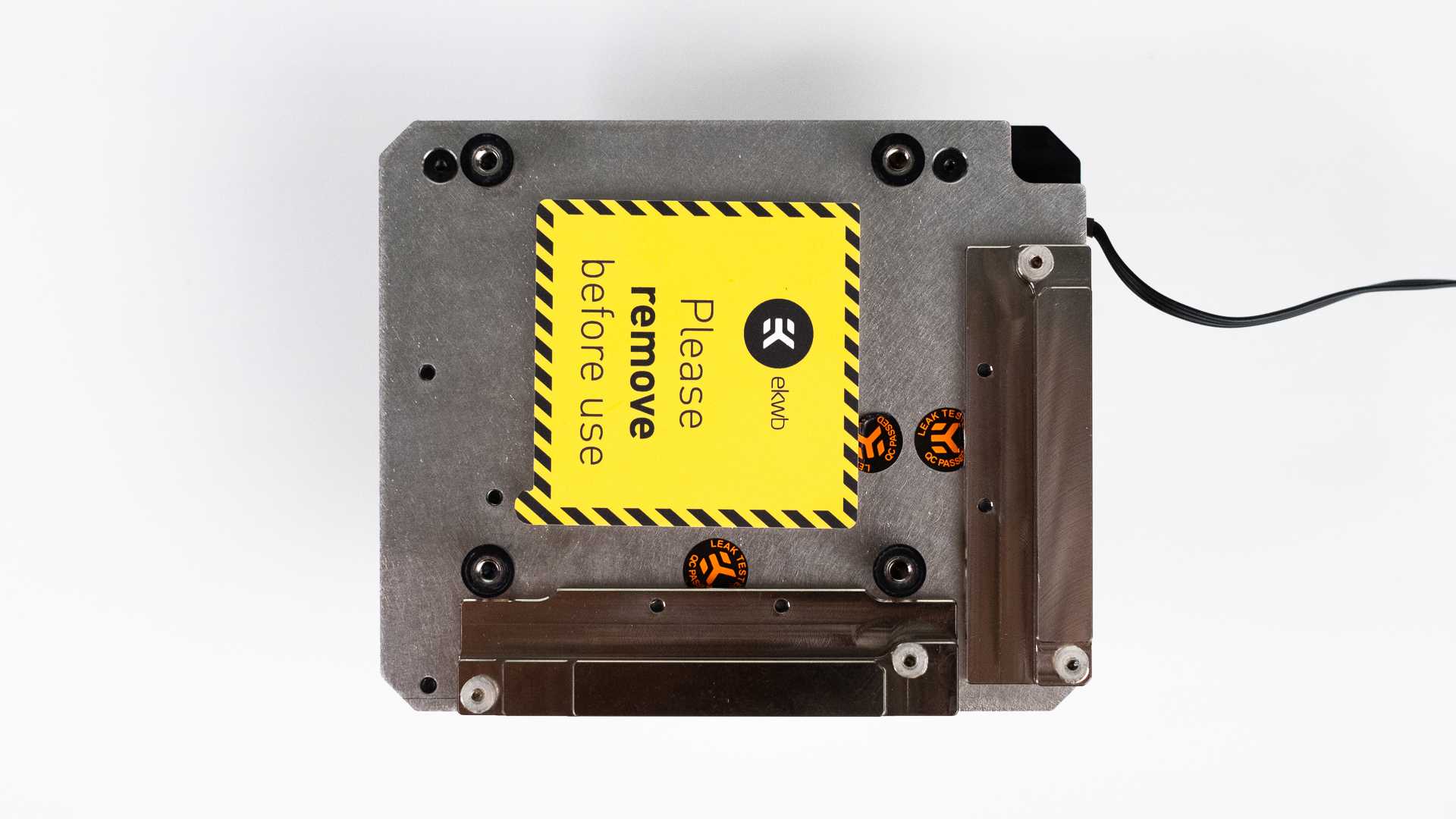 Никелированное медное основание водоблока прикрыто защитной наклейкой. Шнур подключения его адресуемой RGB-подсветки достаточно длинный.