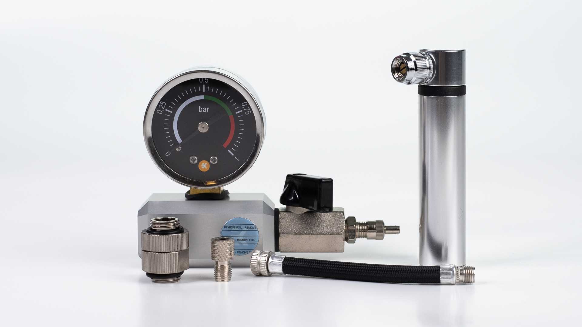 Для проверки системы жидкостного охлаждения на герметичность не нужно заливать жидкость, с помощью комплектного фитинга датчик вкручивается в любой свободный порт 1/4″. Проверка осуществляется воздухом, насосом нагнетается воздух до достижения зелёной зоны на индикаторе давления. Если показатель давления не падает в течении 20-30 минут, то можно утверждать, что контур не будет протекать.