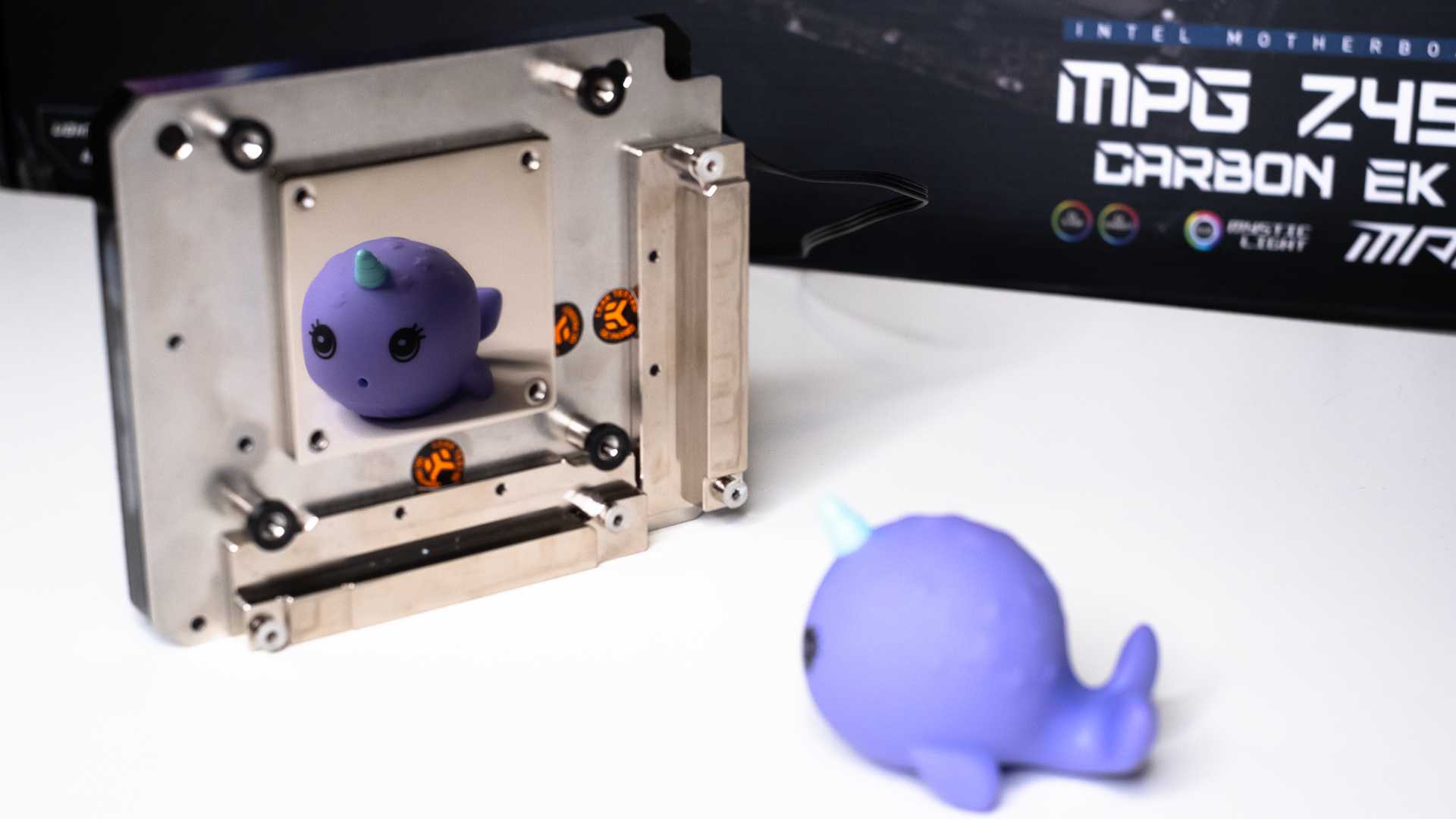 Бэкплейт не предусмотрен, винты вкручиваются в несклонный к деформациям водоблок. Небольшой изгиб материнской платы всё же имеет место быть, но это совершенно не критично. Удобнее всего произвести установку материнской платы на водоблок, совместить отверстия крепления в таком положении проще всего.