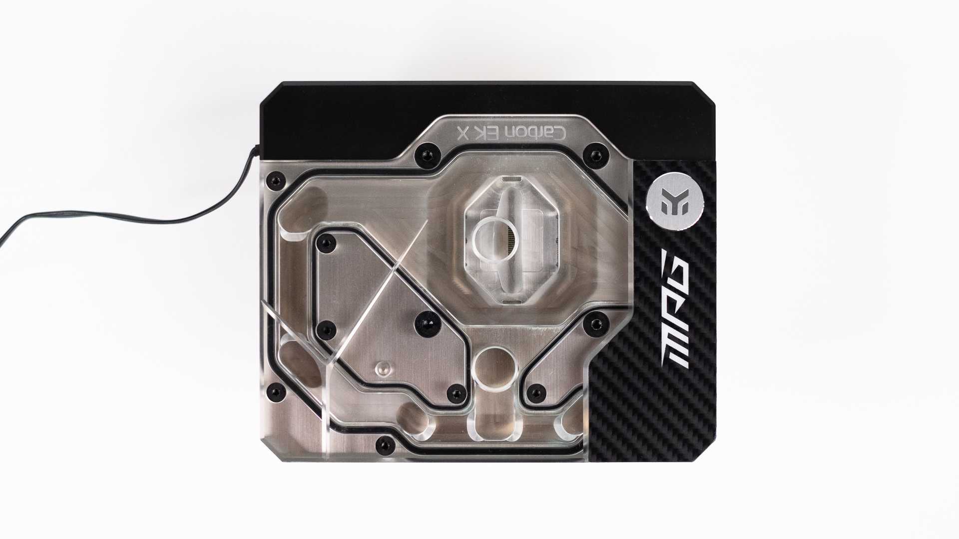 Теперь займёмся продукцией EKWB. Моноблок соответствует актуальной линейке словенского производителя. Косметическое единение с серией Carbon достигнуто декоративной вставкой с узором под карбон. Два отверстия с резьбой для фитингов не совсем равноценны. Рекомендуется использовать как вводный тот, что находится непосредственно над разгонной пластиной, прямо над процессором.