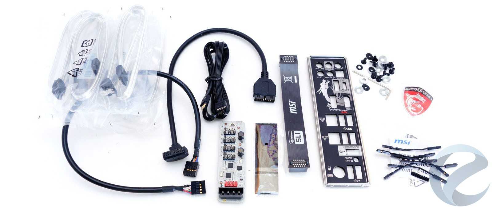 - Шесть серебристых кабелей SATA с защелками, три с прямыми разъемами, еще три с угловым разъемом на одном конце;