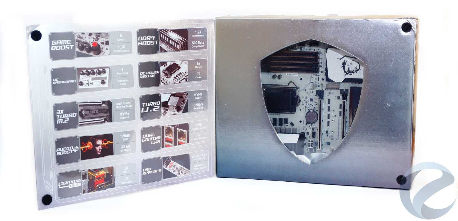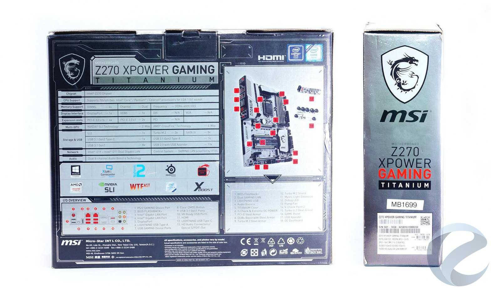 Материнская плата MSI Z270 XPower Gaming Titanium, безусловно, подойдет для энтузиастов оверклокинга. У нее высокий потенциал и масса возможностей по разгону процессоров Kaby Lake с разблокированным множителем. В наличии дополнительные функции по замеру напряжений, индикатор POST-кодов, кнопки включения/перезагрузки, плата OC Dashboard с возможностью подключения через кабель удлинитель и кнопками, изменяющими настройки разгона. На плате распаяны две микросхемы BIOS с кнопкой оперативного переключения, имеется опция Flashback+, позволяющую обновлять BIOS без установленного процессора.