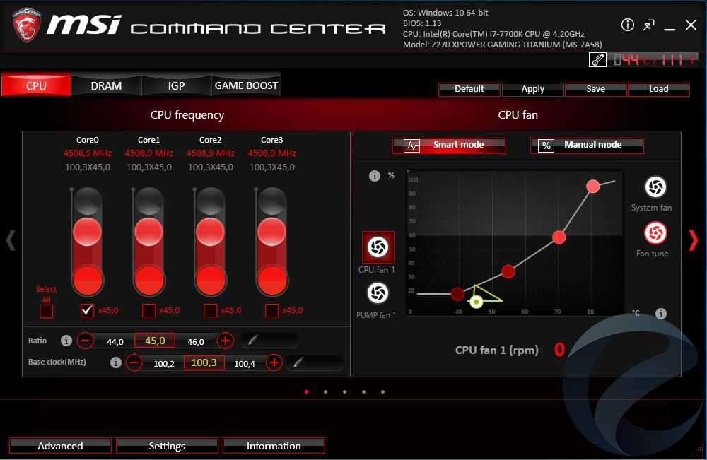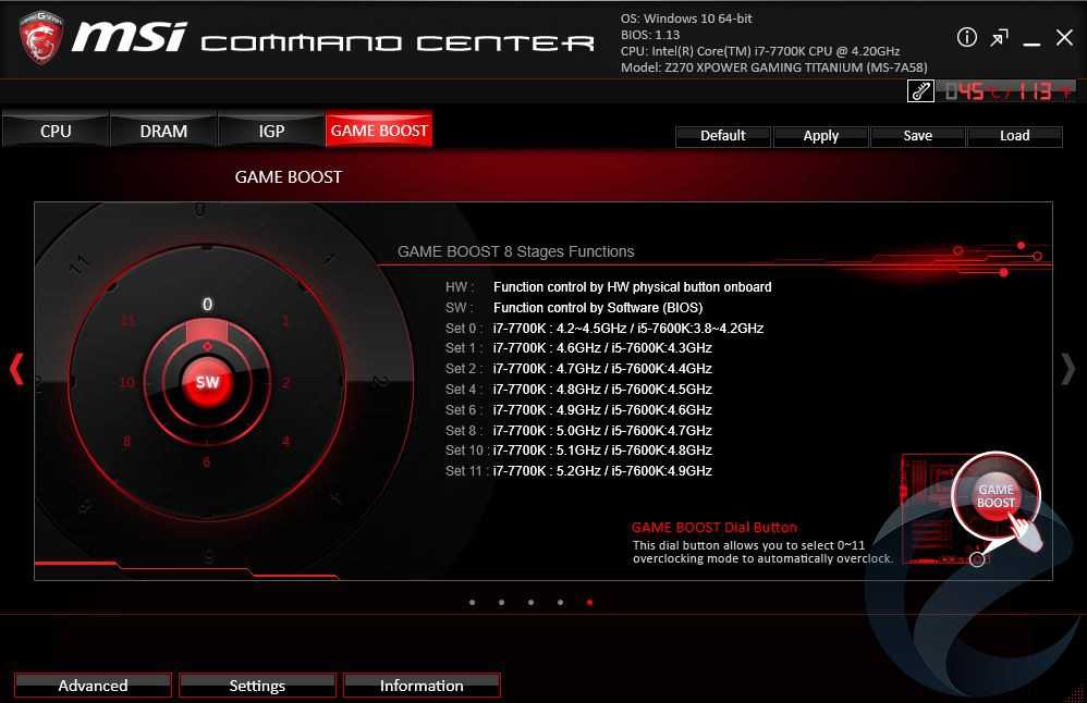 Фирменные утилиты мы подробно рассматривали в обзоре материнской платы MSI Z270 GAMING M5. Стоит только остановиться на вкладке Game Boost утилиты Command Center. Здесь нам предлагается несколько предустановок по разгону процессора. В автоматическом режиме удалось запустить процессор на частоте 4.9 ГГц, автоматически напряжение выставилось 1.33 В, температура самого горячего ядра под нагрузкой составила 81 °С. Эти же установкипод соответствующими номерами дублируются на кнопку «Turbo Boost» на материнской плате. Поворотом кольца возле кнопки выбираем нужный номер предустановки частоти активируем разгон нажатием кнопки. Предварительно в BIOS необходимо выбрать, каким методом будет осуществлятся авторазгон: через Command Center или кнопкой на материнской плате.