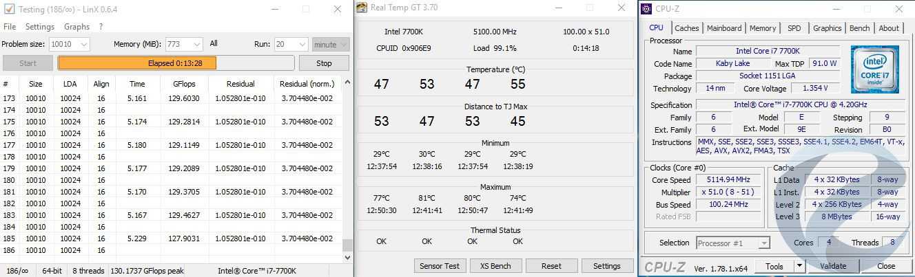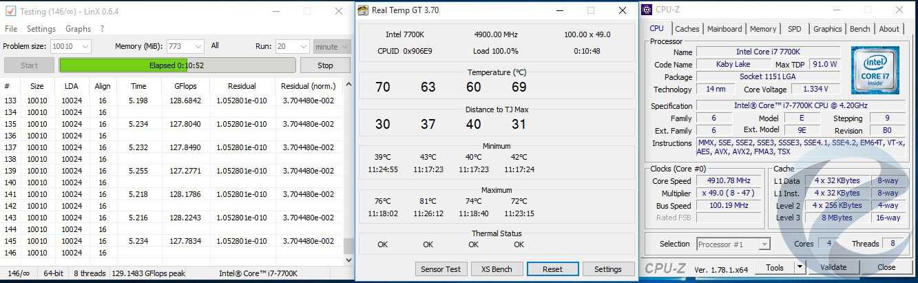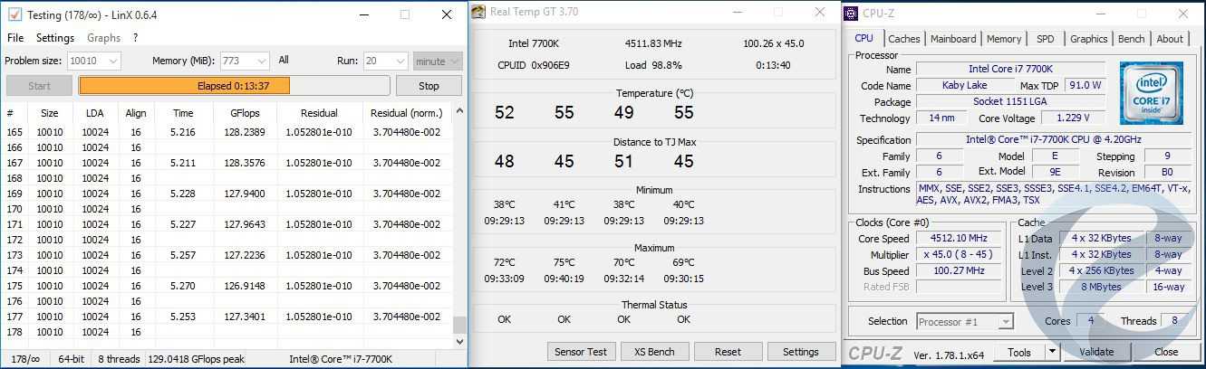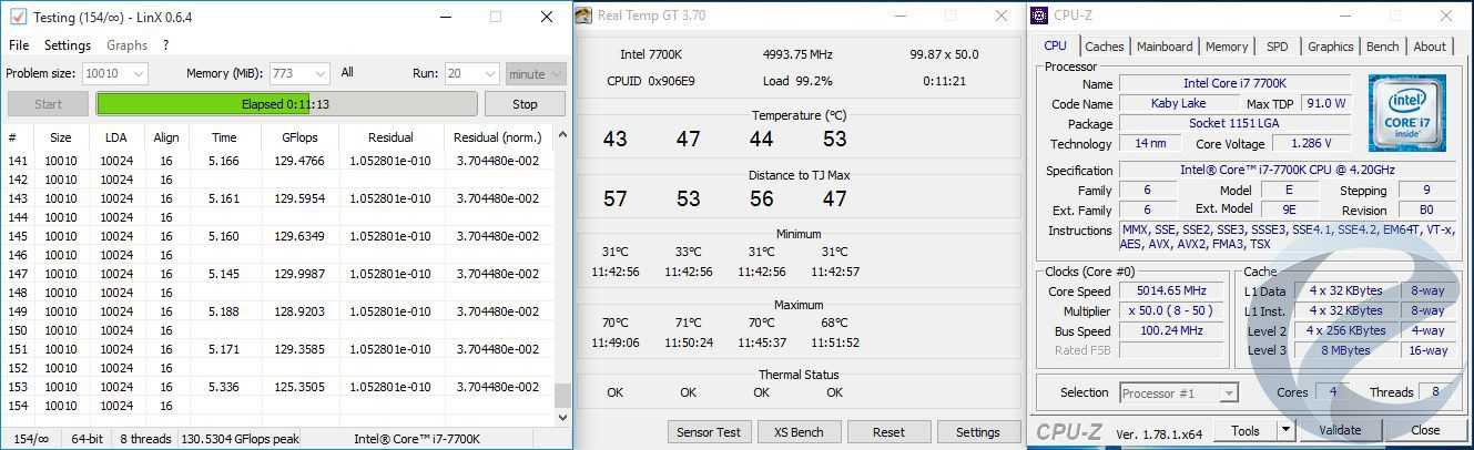 Стабильность работы проверялась тестом LinX 0.6.4 не менее 10 минут. Температура замерялась по самому горячему ядру в программе Real Temp GT 3.70. В дальнейшем стабильность проверялась в тестах.
