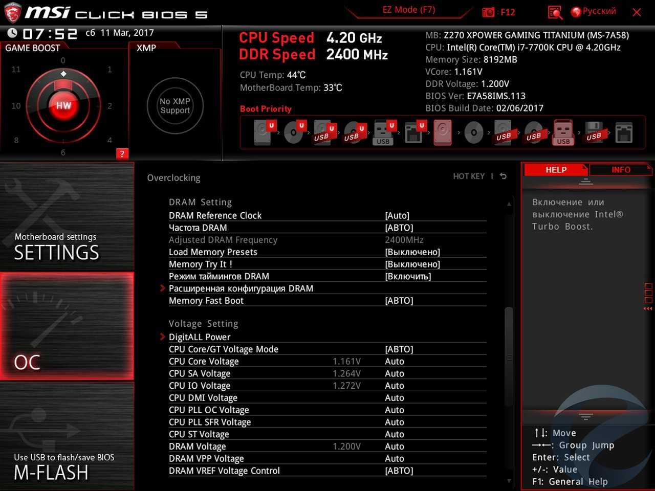У процессоров семейства Kaby Lake разгон во многом зависит именно от возможностей материнской платы. И Z270 XPower Gaming Titanium эти возможности представляет:в BIOS можно изменять множество параметров, особенно разнообразны всевозможные напряжения. Профессиональным оверклокерам будет, где поэкспериментировать.