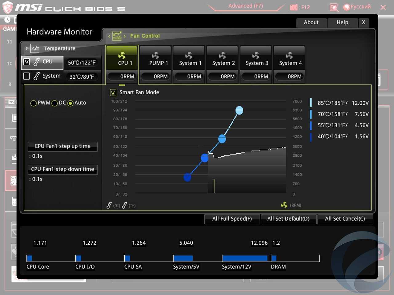 Первый тест прошел на автоматических настройках BIOS с включенным режимом Turbo Boost. Процессор работал на частоте 4.5 ГГц с номинальным напряжением. В простое напряжение сбрасывалось до 0.8 В, а частота оставалась на одном уровне.
