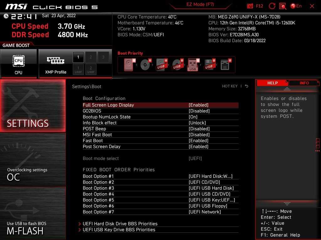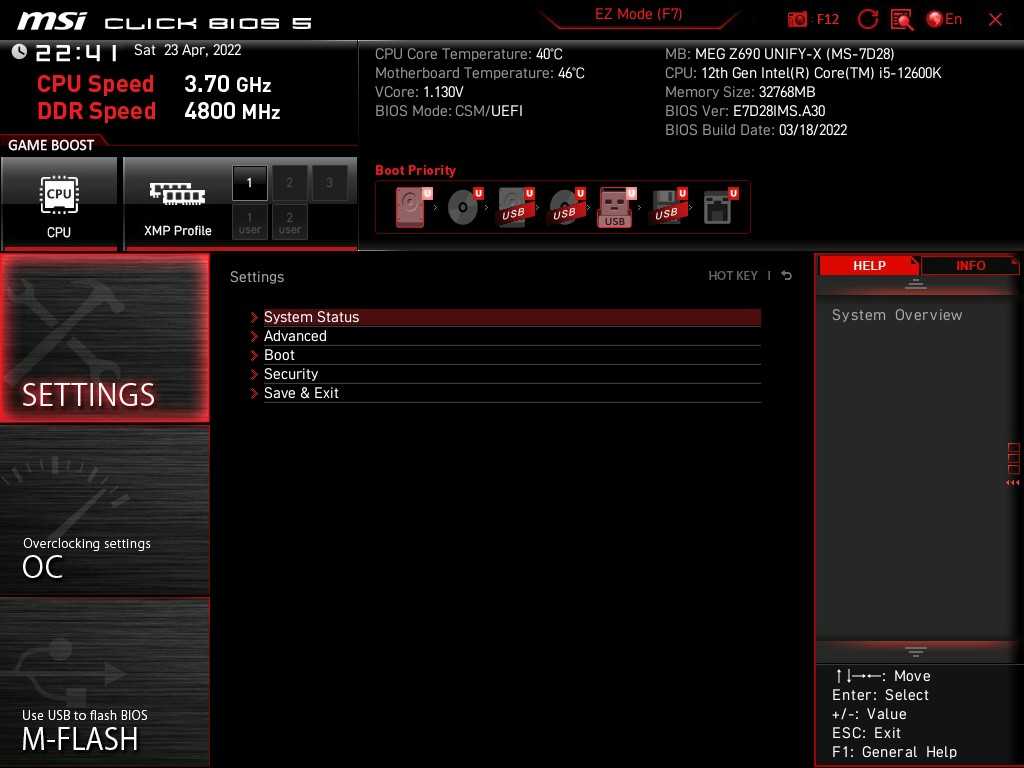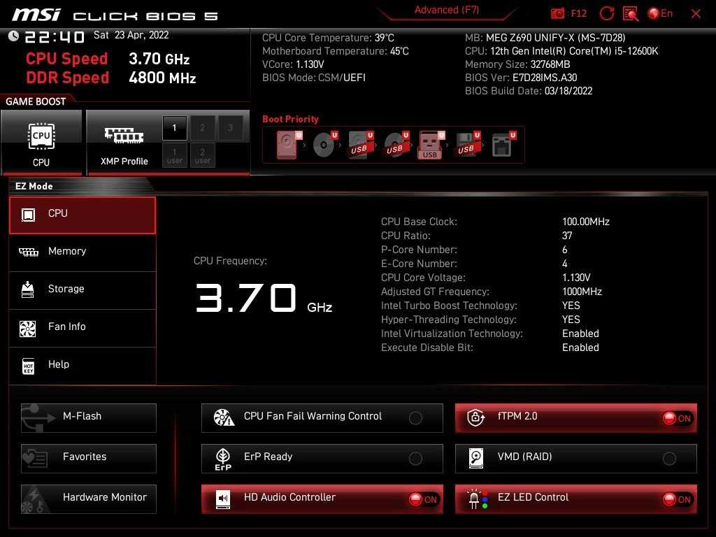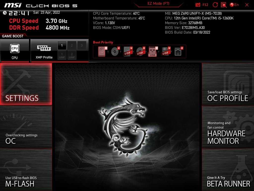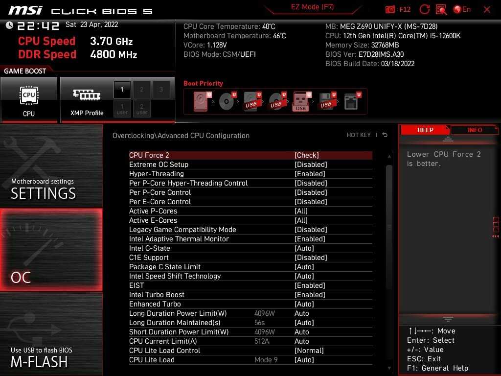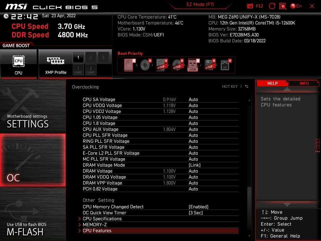 Место центрального процессора на MEG Z690 Unify-X занял процессор Intel Core i5-12600K. Перед тем, как приступить к детальному изучению материнской платы, мы обновили BIOS до самой свежей версии A.30.