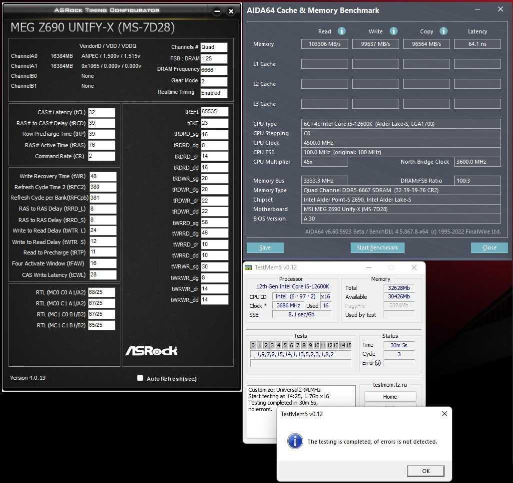 Любителям разгона оперативной памяти MEG Z690 Unify-X способна предложить широкое поле для экспериментов. Используя не самые лучшие модули DDR5, нам удалось добиться стабильности на частоте 6666 МГц со значением тайминга CL32.