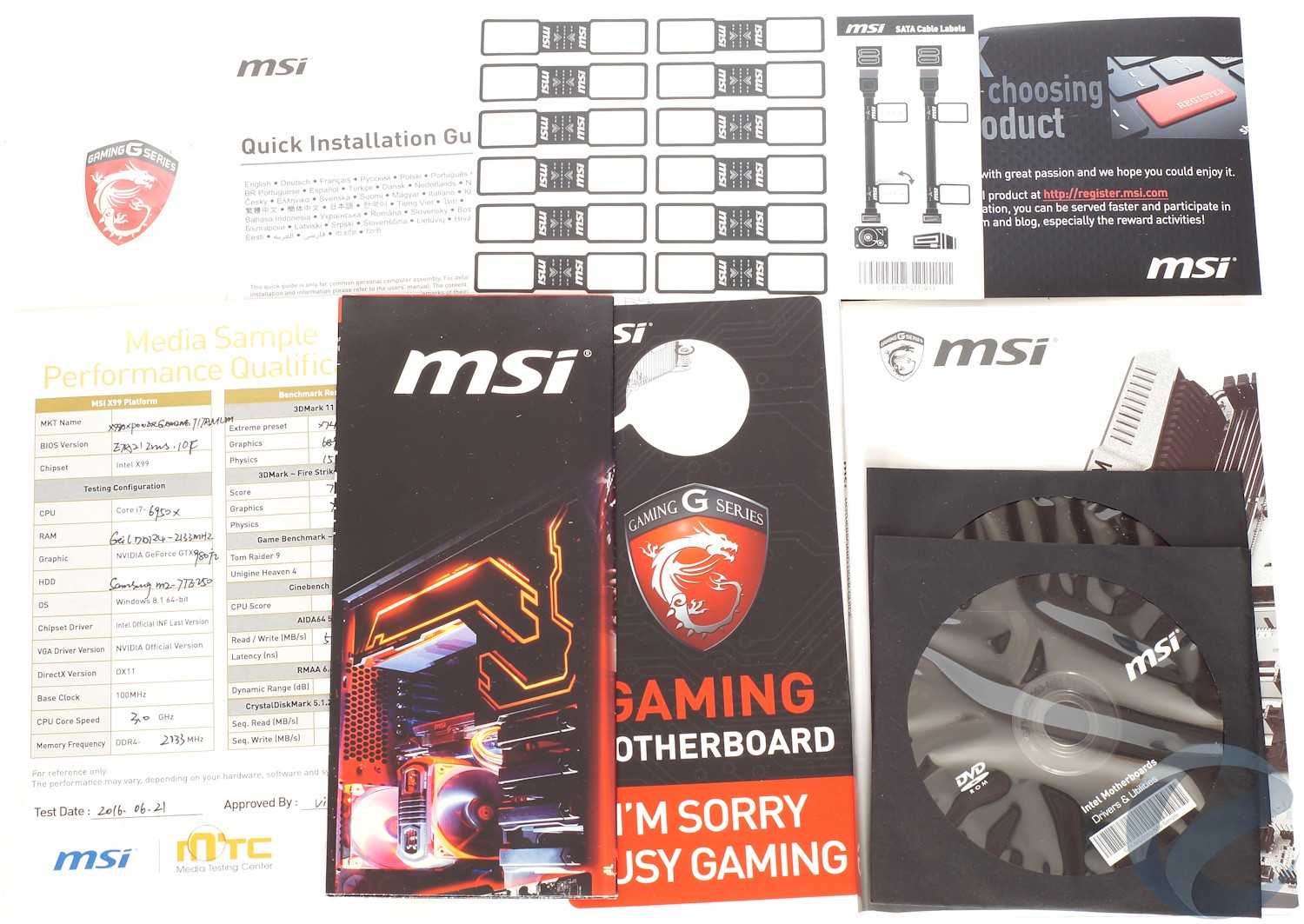 На чёрной коробке спереди красуется крупная буква X, по центру приведено название модели. Сверху можно заметить логотип MSI, снизу – OC. В правом верхнем углу X напечатаны два логотипа Intel.