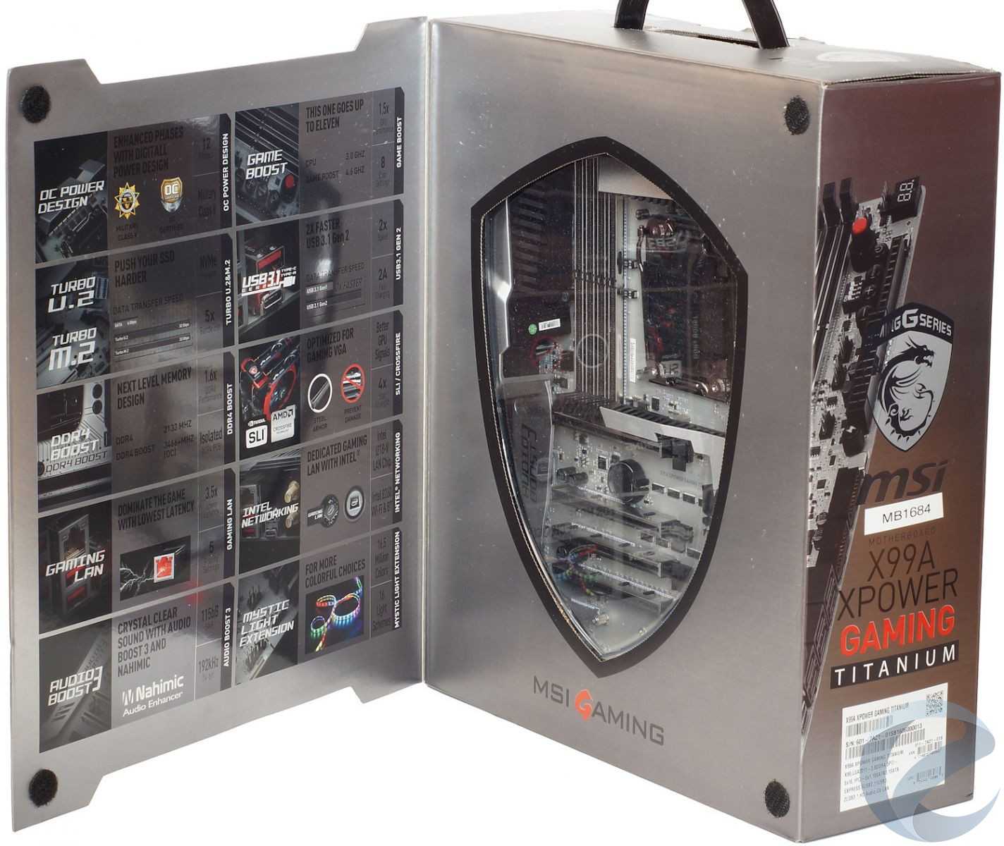 Уже знакомый нам по обзору платы MSI Z170A MPOWER GAMING TITANIUM серебристый дизайн коробкис изображением платы имеется и у упаковки MSI X99A XPOWER GAMING TITANIUM. Отличие – это наличие удобной ручки для переноски.