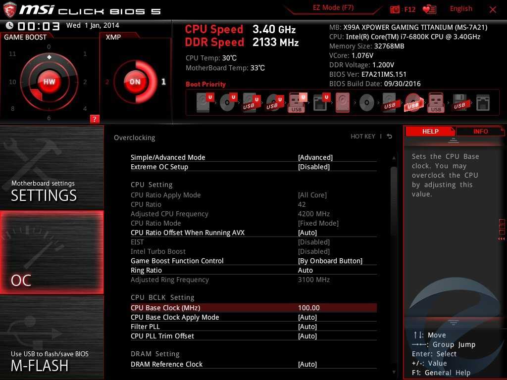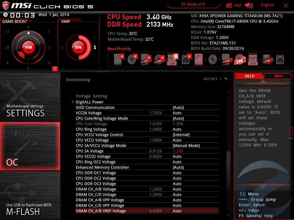 Напомним, что материнская плата MSI X99A XPOWER GAMING TITANIUM имеет расширенные возможности разгона и одной из них является GAME BOOST Knob, позволяющийвыбрать один из вариантов разгона – все остальное сделает сама плата. Например, выбрав с помощью колесика режим 8 для процессора Intel Core i7 6800K в BIOS мы получили частоту 4200 МГц (множитель х42) с автоматическим увеличением напряжений Vcore=1.350V и Vсpu_sa (System Agent)=1.250V.