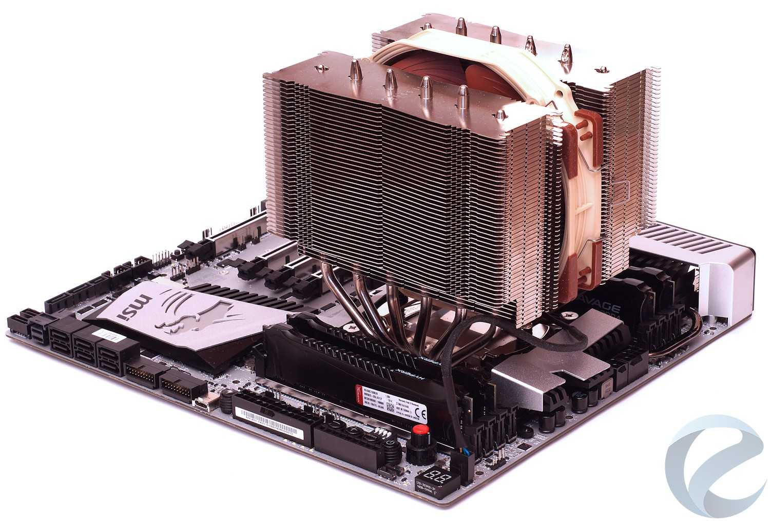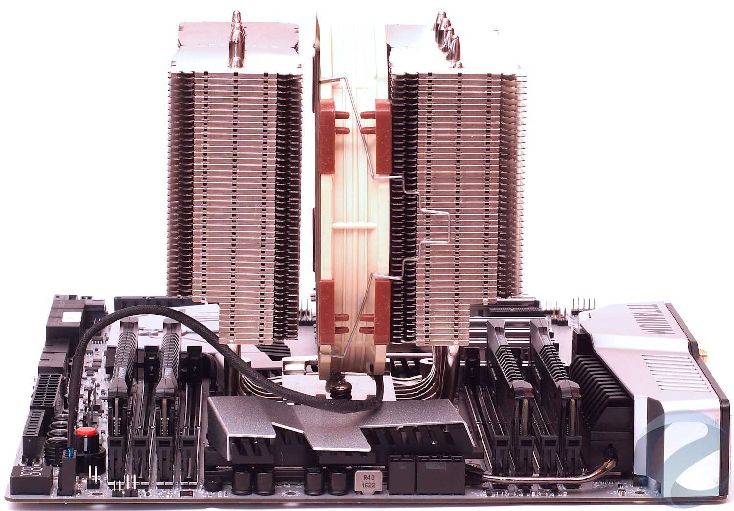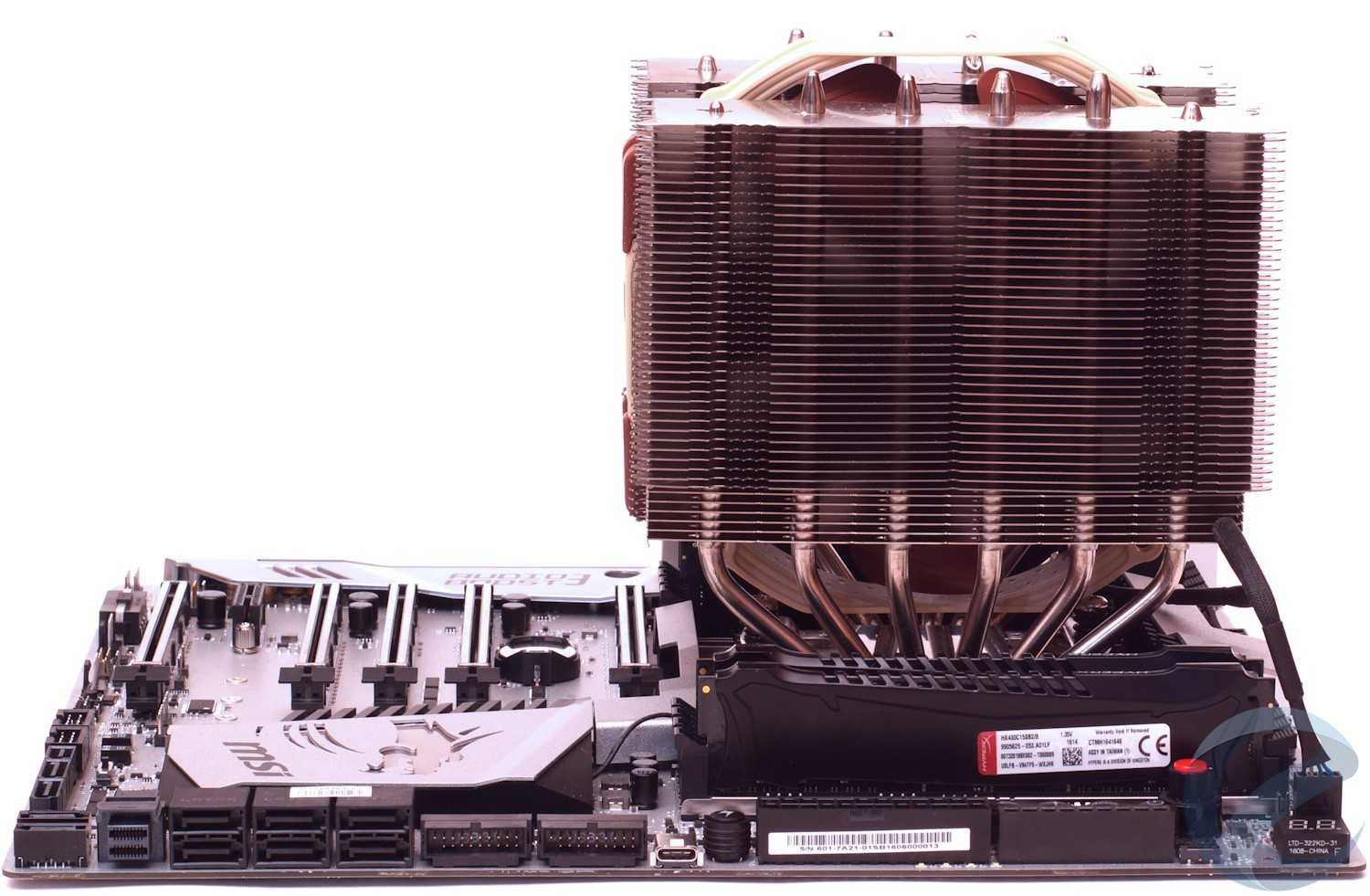 Основная проблема с материнской платой MSI X99A XPOWER GAMING TITANIUM может возникнуть при желании использовать габаритный/широкий кулер, например, такой как Noctua NH-D15 (ширина 150 мм), который сделает невозможным установку видеокарты в самый верхний слот PCI-E x16. Как следствие, для получения максимальной пропускной способности видеокартыпридется использовать процессор с 40-а линиями PCI-E и слот PCI_E4 (х16). А если ставить видеокарту в самый верхний слот PCI-E x16, то будет нужен «узкий» кулер или, как наиболее оптимальный вариант,переход на систему жидкостного охлаждения.
