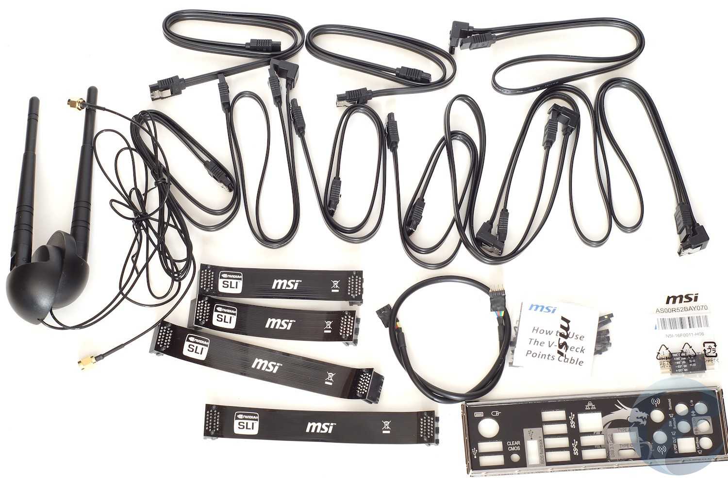 Богатая комплектация подчеркивает топовый уровень материнской платы. В отдельной коробке находится обильное количество информационного материала: краткое и полное руководство пользователя, наклейки на кабели, логотип, информация о результатах тестирования, картонка на дверную ручку «Не беспокоить» и два DVD диска. Также внутри можно найти комплекты кабелей: 10 x SATA, 2 внешних антенны с магнитным креплением, гибкие мосты SLI (2 длинных и 2 коротких), кабель для подключения RGB ленты, заднююпанель ввода-вывода, набор кабелей V-Check для замера напряжений.