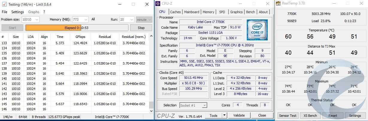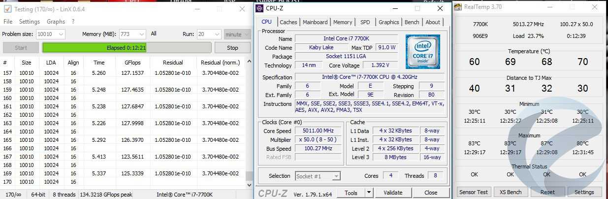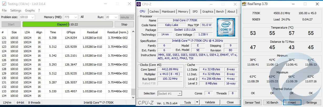 Стабильность работы проверялась тестом LinX 0.6.4 не менее 10 минут. Температура замерялась по самому горячему ядру в программе Real Temp GT 3.70. В дальнейшем стабильность проверялась в тестах.